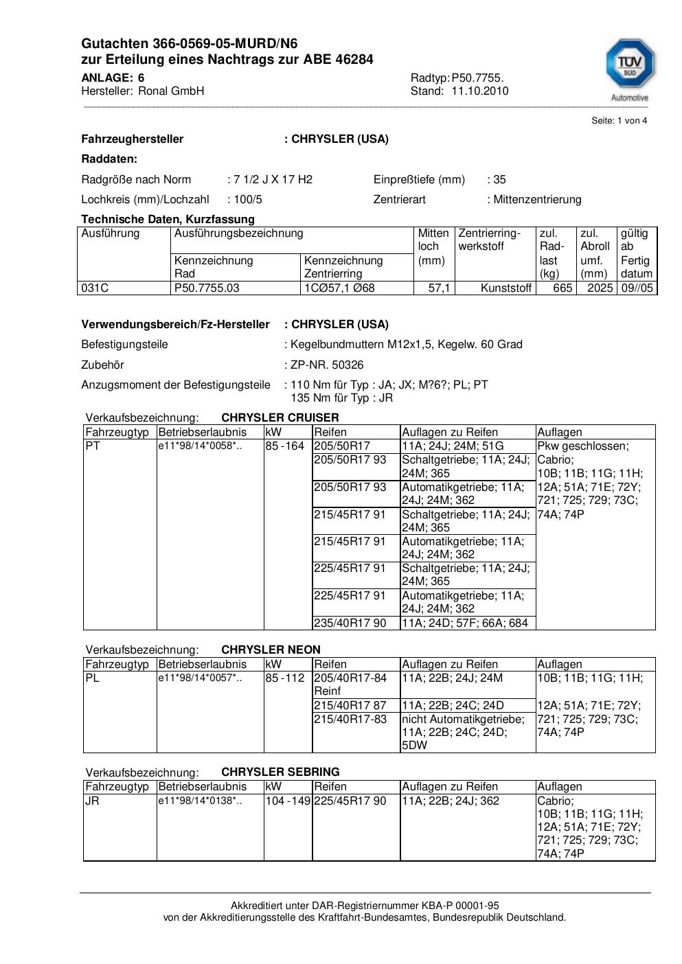 Dieses Gutachten (abe) bezieht sich auf die Alufelge Ronal P50.7755 in der Ausführung 2Jx17 ET 0, Mittenloch 0 mm (KBA 46284). Im PDF findest du typischerweise zulässige Reifengrößen, Auflagen/Anbauhinweise und – je nach Dokument – Hinweise zur Eintragung.