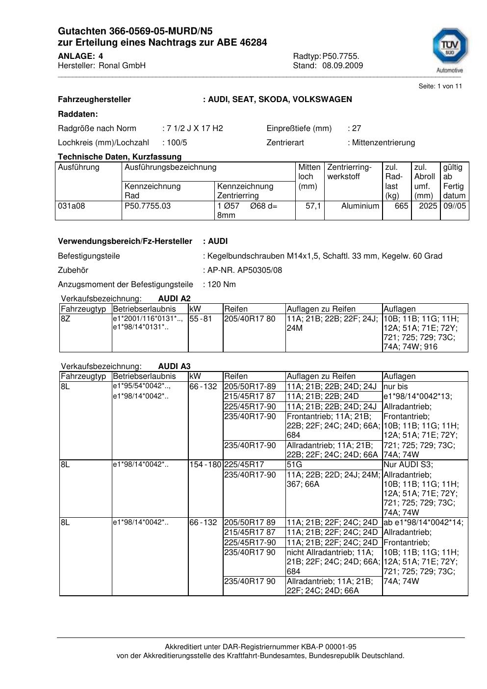 Felgengutachten / abe für Alufelgen Ronal P50.7755 (2Jx17 ET 0, Mittenloch 0 mm) mit KBA 46284 (Zertifikatsnummer 46284). Hier kostenlos als PDF herunterladen. Der Download-Link ist 24 Stunden gültig und kann bis zu zwei Mal verwendet werden.