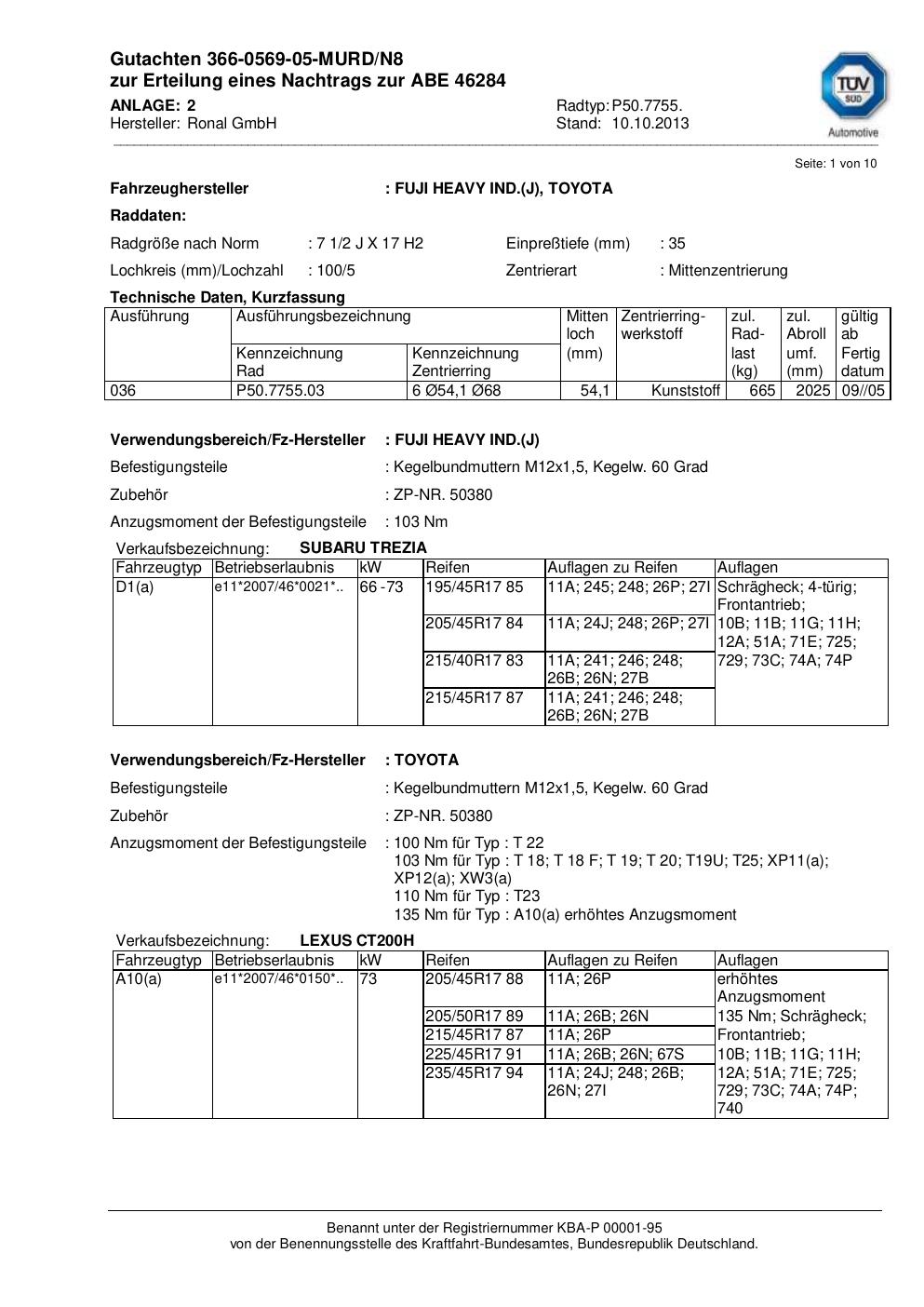 Dieses Gutachten (abe) bezieht sich auf die Alufelge Ronal P50.7755 in der Ausführung 2Jx17 ET 0, Mittenloch 0 mm (KBA 46284). Im PDF findest du typischerweise zulässige Reifengrößen, Auflagen/Anbauhinweise und – je nach Dokument – Hinweise zur Eintragung.