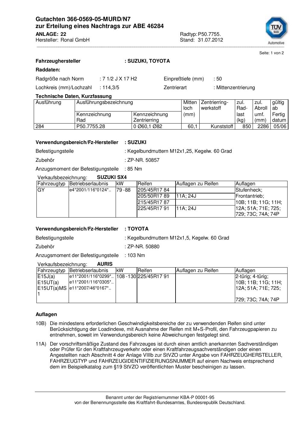 Dieses Gutachten (abe) bezieht sich auf die Alufelge Ronal P50.7755 in der Ausführung 2Jx17 ET 0, Mittenloch 0 mm (KBA 46284). Im PDF findest du typischerweise zulässige Reifengrößen, Auflagen/Anbauhinweise und – je nach Dokument – Hinweise zur Eintragung.