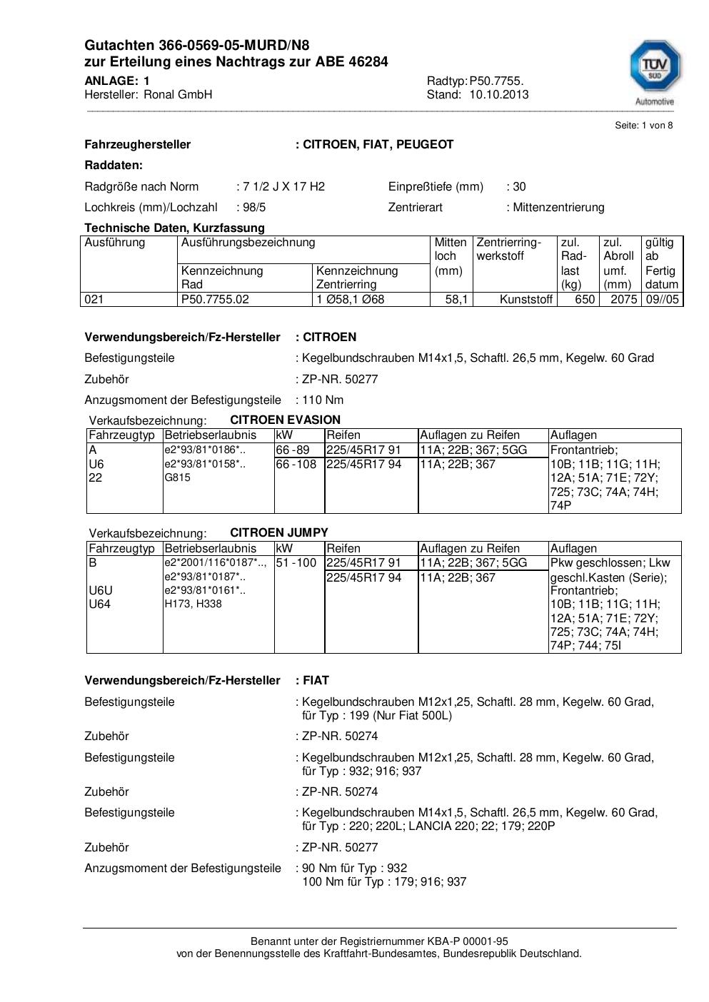 Dieses Gutachten (abe) bezieht sich auf die Alufelge Ronal P50.7755 in der Ausführung 2Jx17 ET 0, Mittenloch 0 mm (KBA 46284). Im PDF findest du typischerweise zulässige Reifengrößen, Auflagen/Anbauhinweise und – je nach Dokument – Hinweise zur Eintragung.
