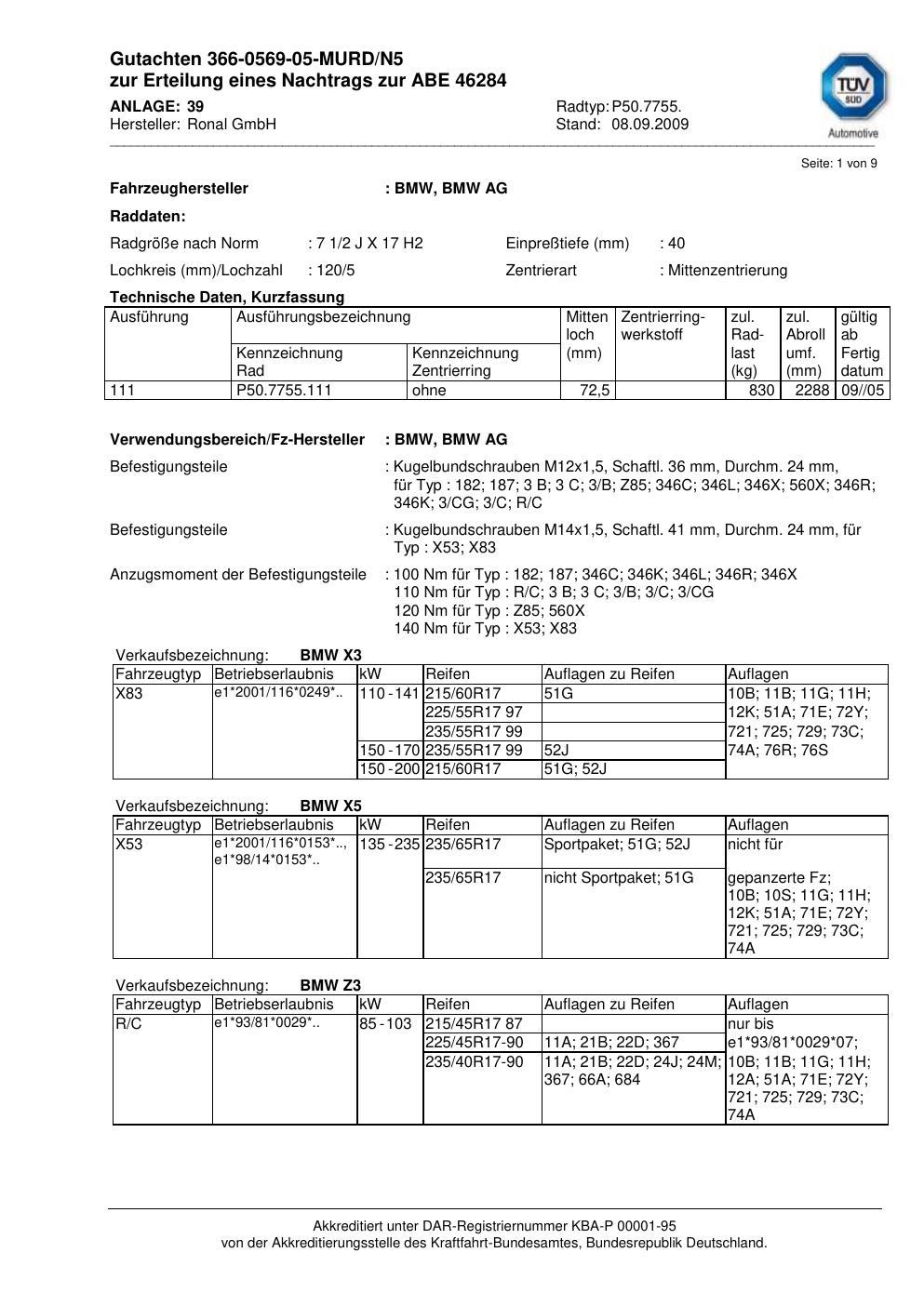 Dieses Gutachten (abe) bezieht sich auf die Alufelge Ronal P50.7755 in der Ausführung 2Jx17 ET 0, Mittenloch 0 mm (KBA 46284). Im PDF findest du typischerweise zulässige Reifengrößen, Auflagen/Anbauhinweise und – je nach Dokument – Hinweise zur Eintragung.