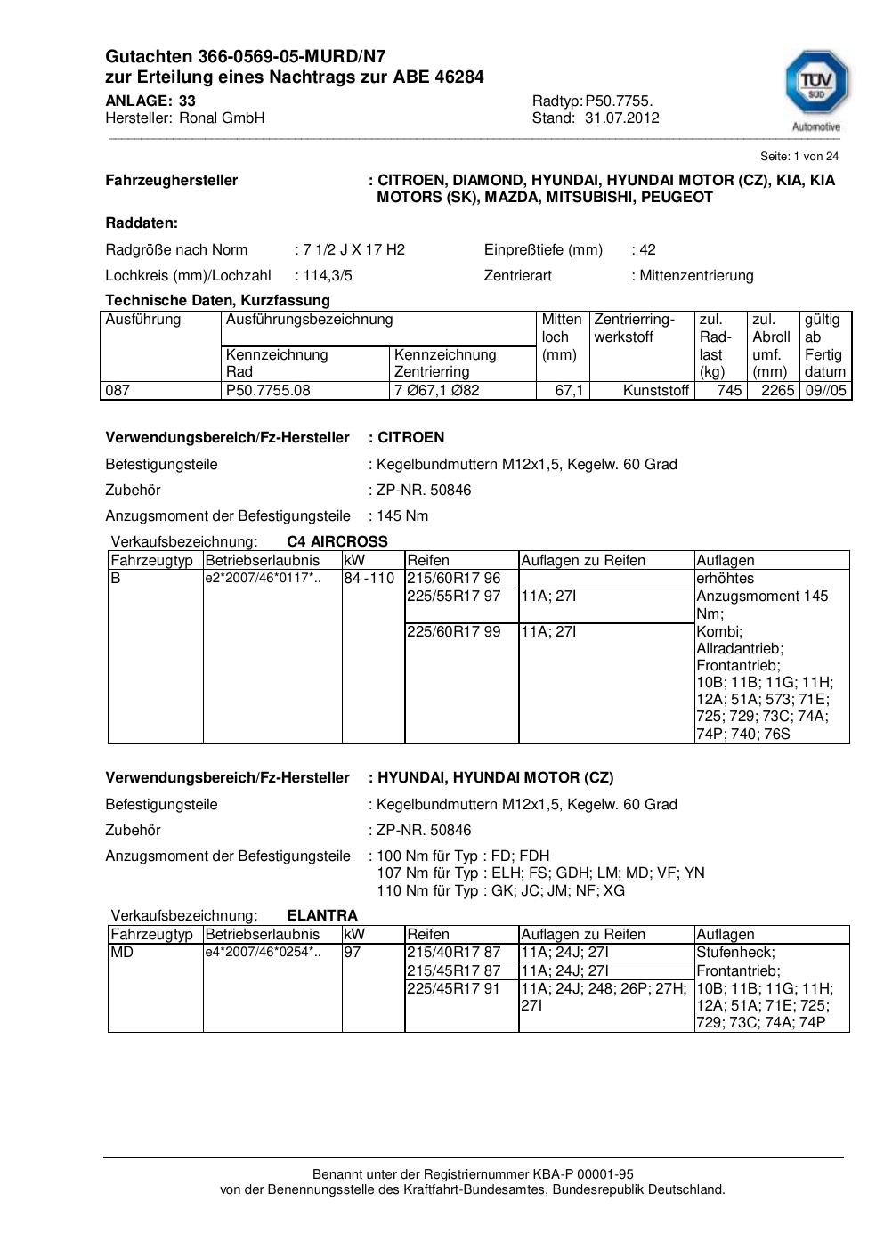 Dieses Gutachten (abe) bezieht sich auf die Alufelge Ronal P50.7755 in der Ausführung 2Jx17 ET 0, Mittenloch 0 mm (KBA 46284). Im PDF findest du typischerweise zulässige Reifengrößen, Auflagen/Anbauhinweise und – je nach Dokument – Hinweise zur Eintragung.