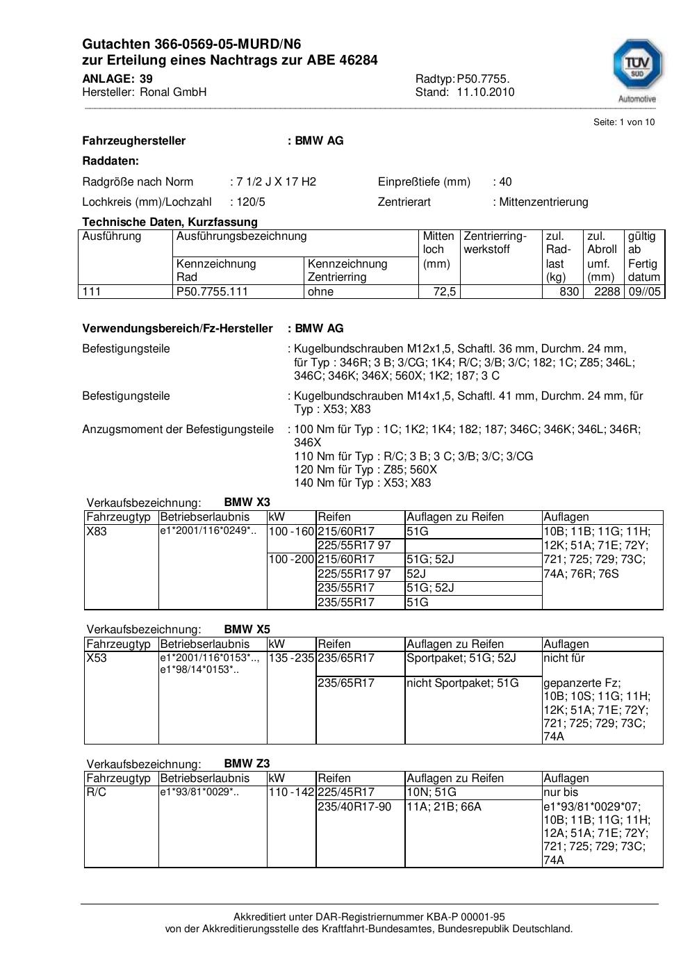 Dieses Gutachten (abe) bezieht sich auf die Alufelge Ronal P50.7755 in der Ausführung 2Jx17 ET 0, Mittenloch 0 mm (KBA 46284). Im PDF findest du typischerweise zulässige Reifengrößen, Auflagen/Anbauhinweise und – je nach Dokument – Hinweise zur Eintragung.