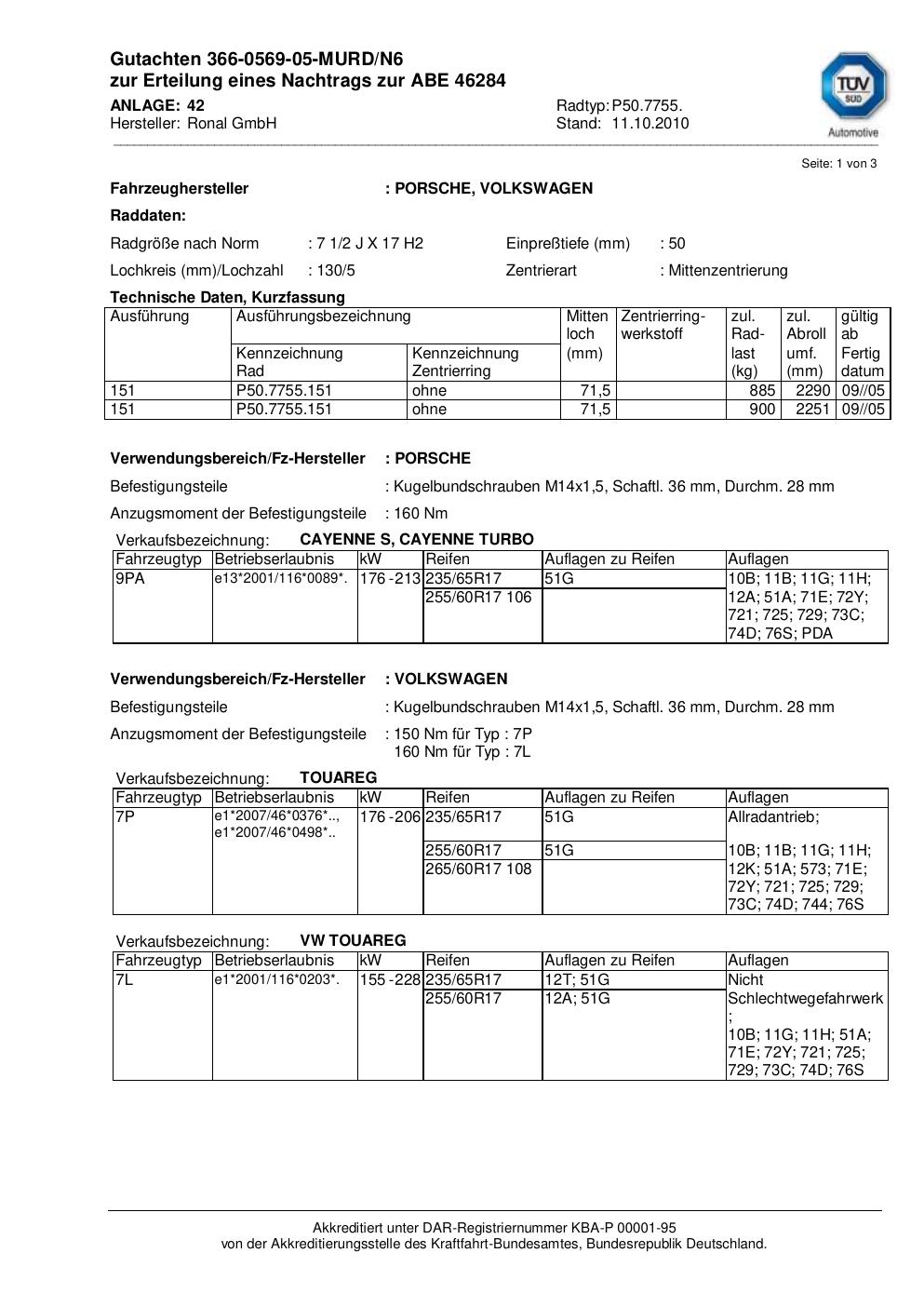 Felgengutachten / abe für Alufelgen Ronal P50.7755 (2Jx17 ET 0, Mittenloch 0 mm) mit KBA 46284 (Zertifikatsnummer 46284). Hier kostenlos als PDF herunterladen. Der Download-Link ist 24 Stunden gültig und kann bis zu zwei Mal verwendet werden.