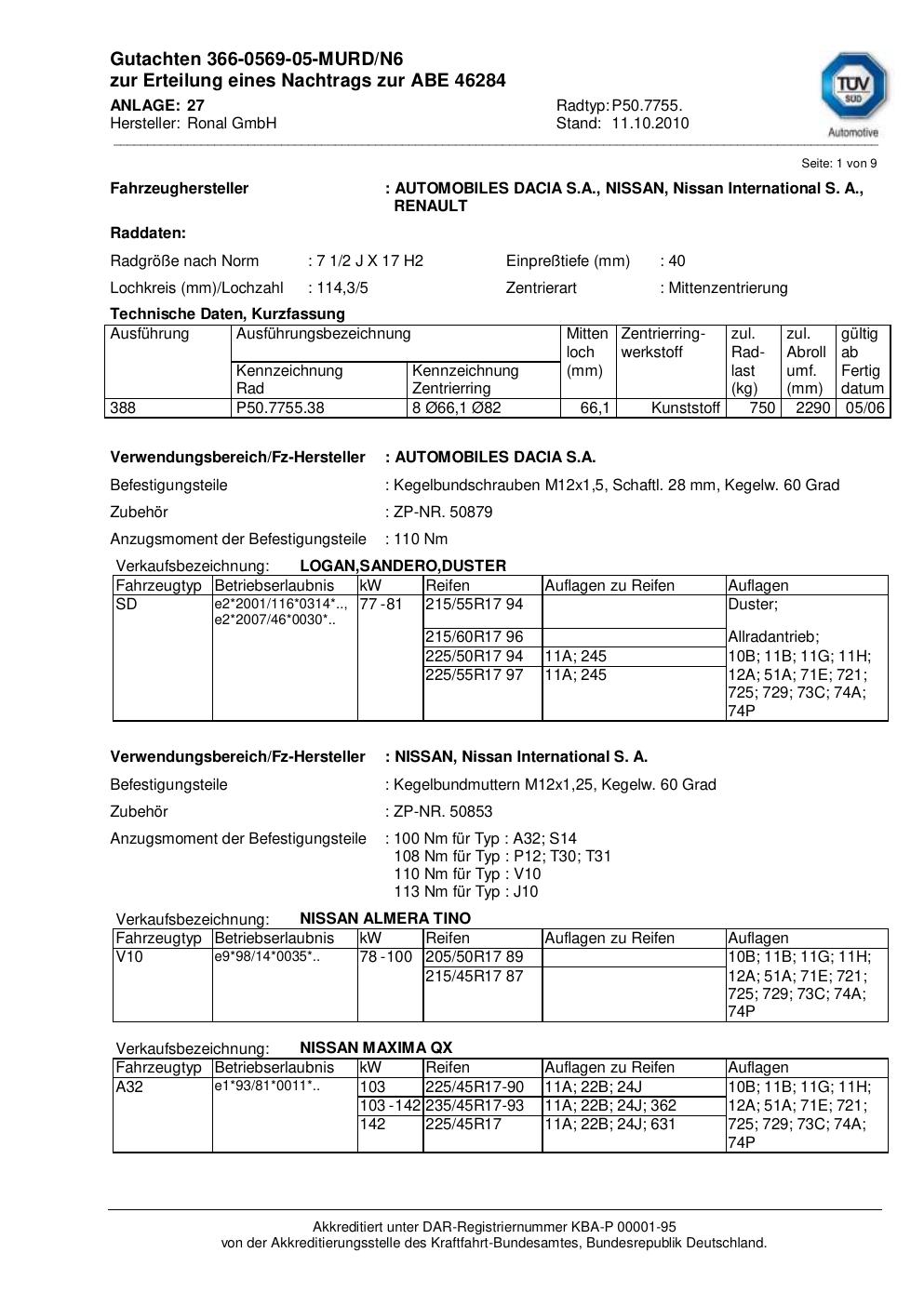 Dieses Gutachten (abe) bezieht sich auf die Alufelge Ronal P50.7755 in der Ausführung 2Jx17 ET 0, Mittenloch 0 mm (KBA 46284). Im PDF findest du typischerweise zulässige Reifengrößen, Auflagen/Anbauhinweise und – je nach Dokument – Hinweise zur Eintragung.