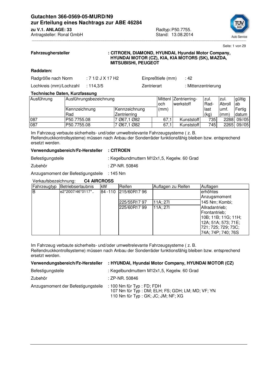 Dieses Gutachten (abe) bezieht sich auf die Alufelge Ronal P50.7755 in der Ausführung 2Jx17 ET 0, Mittenloch 0 mm (KBA 46284). Im PDF findest du typischerweise zulässige Reifengrößen, Auflagen/Anbauhinweise und – je nach Dokument – Hinweise zur Eintragung.