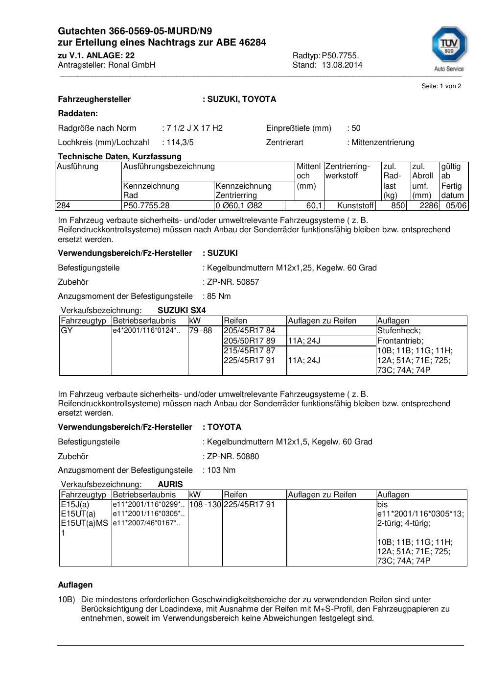 Dieses Gutachten (abe) bezieht sich auf die Alufelge Ronal P50.7755 in der Ausführung 2Jx17 ET 0, Mittenloch 0 mm (KBA 46284). Im PDF findest du typischerweise zulässige Reifengrößen, Auflagen/Anbauhinweise und – je nach Dokument – Hinweise zur Eintragung.