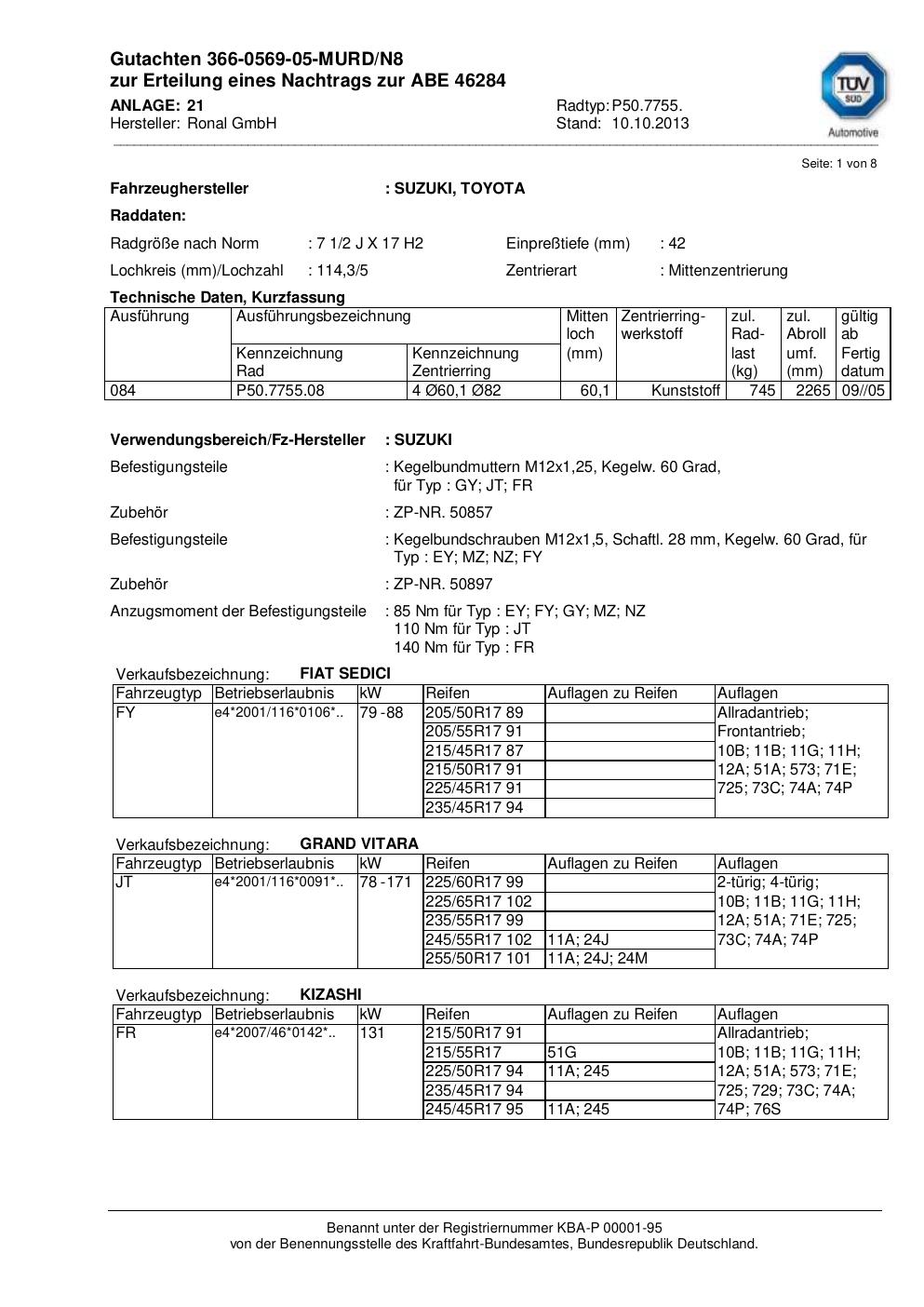 Dieses Gutachten (abe) bezieht sich auf die Alufelge Ronal P50.7755 in der Ausführung 2Jx17 ET 0, Mittenloch 0 mm (KBA 46284). Im PDF findest du typischerweise zulässige Reifengrößen, Auflagen/Anbauhinweise und – je nach Dokument – Hinweise zur Eintragung.