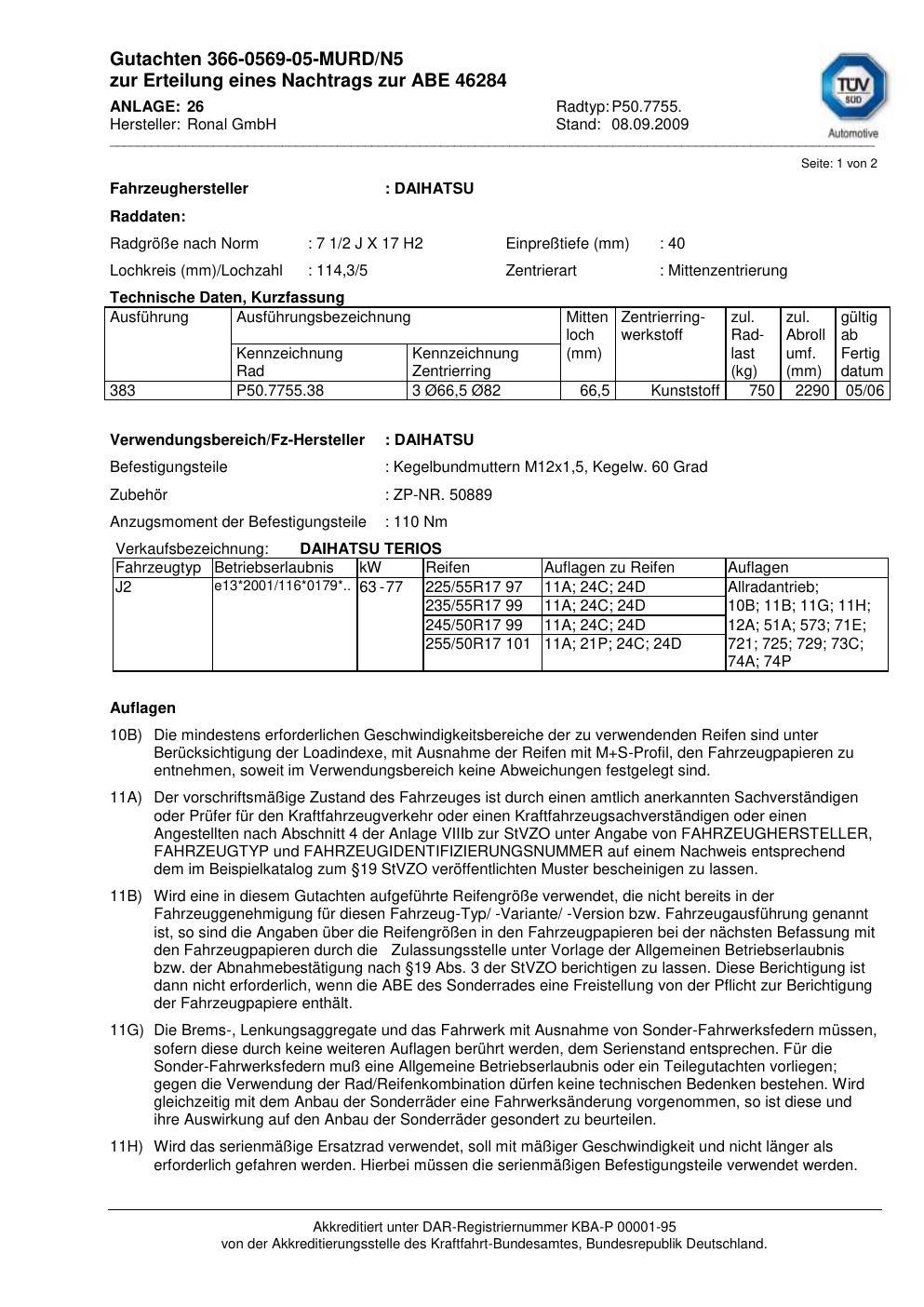 Dieses Gutachten (abe) bezieht sich auf die Alufelge Ronal P50.7755 in der Ausführung 2Jx17 ET 0, Mittenloch 0 mm (KBA 46284). Im PDF findest du typischerweise zulässige Reifengrößen, Auflagen/Anbauhinweise und – je nach Dokument – Hinweise zur Eintragung.