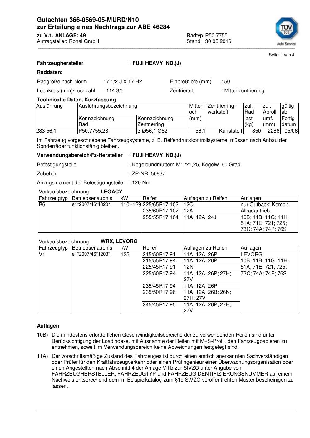 Dieses Gutachten (abe) bezieht sich auf die Alufelge Ronal P50.7755 in der Ausführung 2Jx17 ET 0, Mittenloch 0 mm (KBA 46284). Im PDF findest du typischerweise zulässige Reifengrößen, Auflagen/Anbauhinweise und – je nach Dokument – Hinweise zur Eintragung.