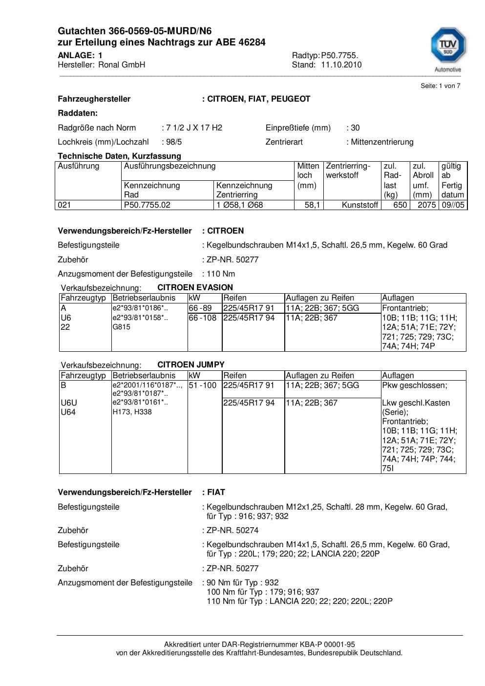 Felgengutachten / abe für Alufelgen Ronal P50.7755 (2Jx17 ET 0, Mittenloch 0 mm) mit KBA 46284 (Zertifikatsnummer 46284). Hier kostenlos als PDF herunterladen. Der Download-Link ist 24 Stunden gültig und kann bis zu zwei Mal verwendet werden.