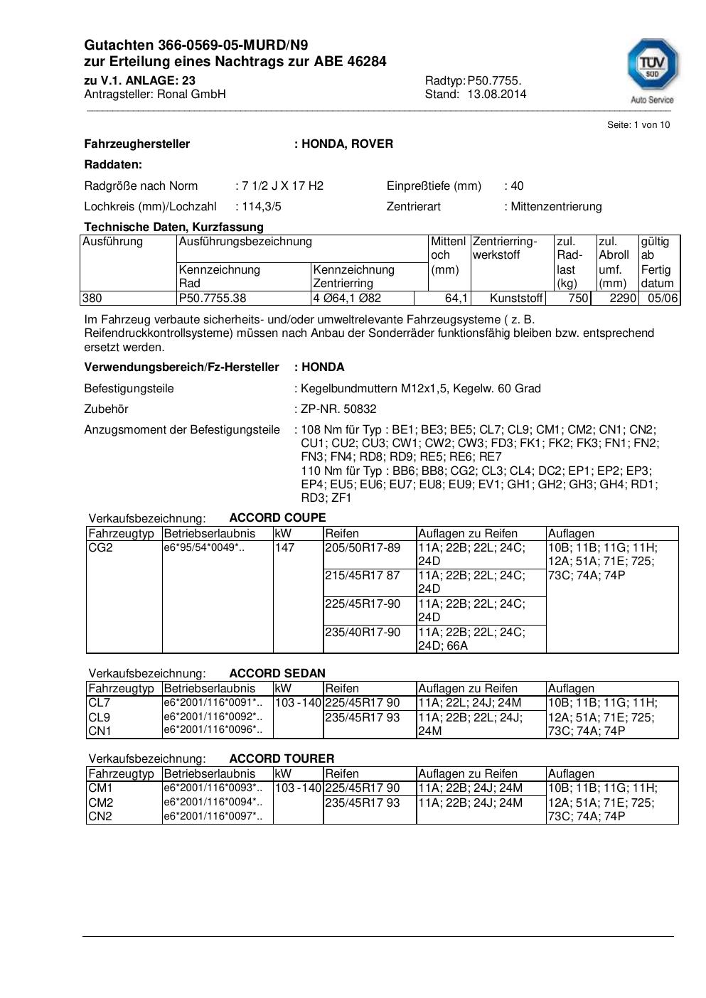 Dieses Gutachten (abe) bezieht sich auf die Alufelge Ronal P50.7755 in der Ausführung 2Jx17 ET 0, Mittenloch 0 mm (KBA 46284). Im PDF findest du typischerweise zulässige Reifengrößen, Auflagen/Anbauhinweise und – je nach Dokument – Hinweise zur Eintragung.