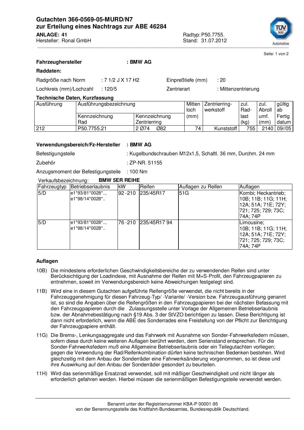 Dieses Gutachten (abe) bezieht sich auf die Alufelge Ronal P50.7755 in der Ausführung 2Jx17 ET 0, Mittenloch 0 mm (KBA 46284). Im PDF findest du typischerweise zulässige Reifengrößen, Auflagen/Anbauhinweise und – je nach Dokument – Hinweise zur Eintragung.