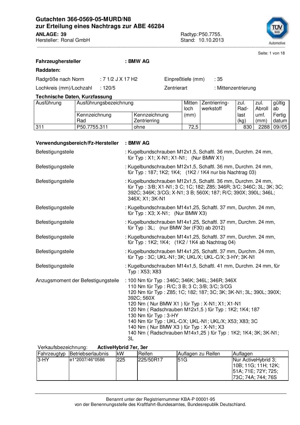 Dieses Gutachten (abe) bezieht sich auf die Alufelge Ronal P50.7755 in der Ausführung 2Jx17 ET 0, Mittenloch 0 mm (KBA 46284). Im PDF findest du typischerweise zulässige Reifengrößen, Auflagen/Anbauhinweise und – je nach Dokument – Hinweise zur Eintragung.