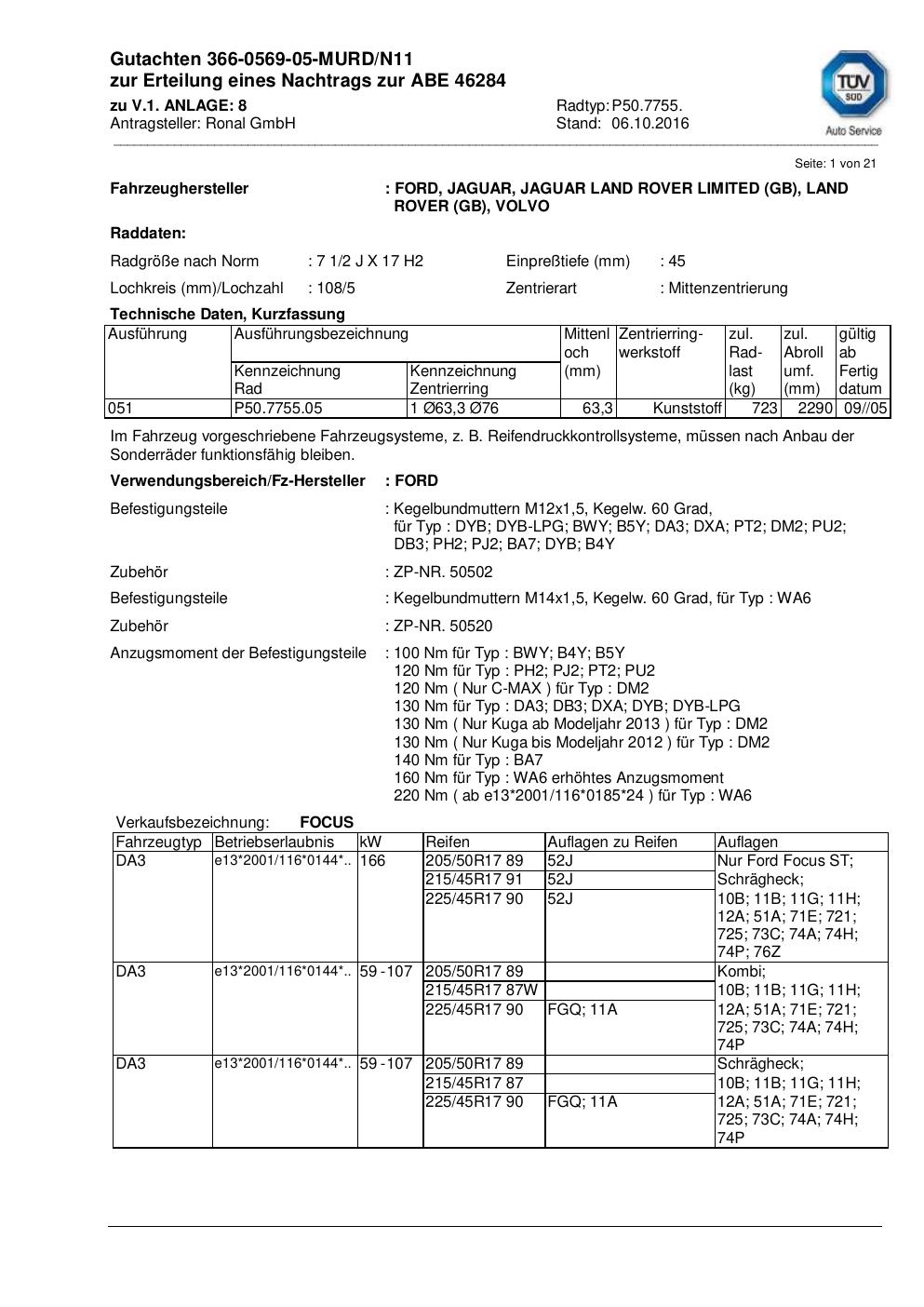 Dieses Gutachten (abe) bezieht sich auf die Alufelge Ronal P50.7755 in der Ausführung 2Jx17 ET 0, Mittenloch 0 mm (KBA 46284). Im PDF findest du typischerweise zulässige Reifengrößen, Auflagen/Anbauhinweise und – je nach Dokument – Hinweise zur Eintragung.