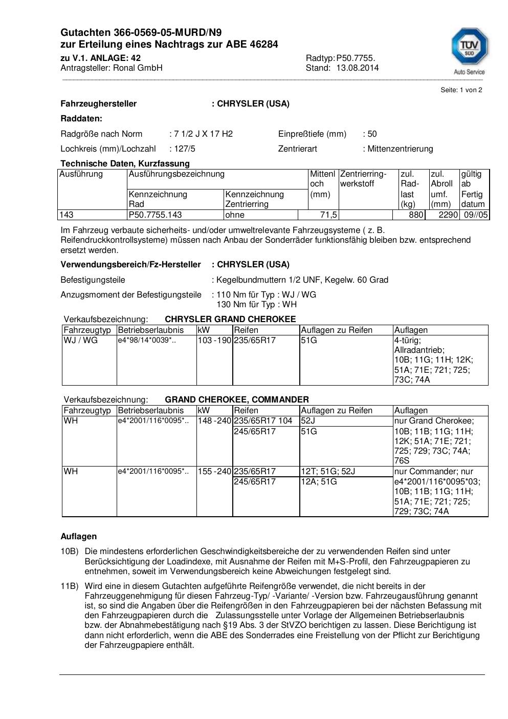 Dieses Gutachten (abe) bezieht sich auf die Alufelge Ronal P50.7755 in der Ausführung 2Jx17 ET 0, Mittenloch 0 mm (KBA 46284). Im PDF findest du typischerweise zulässige Reifengrößen, Auflagen/Anbauhinweise und – je nach Dokument – Hinweise zur Eintragung.