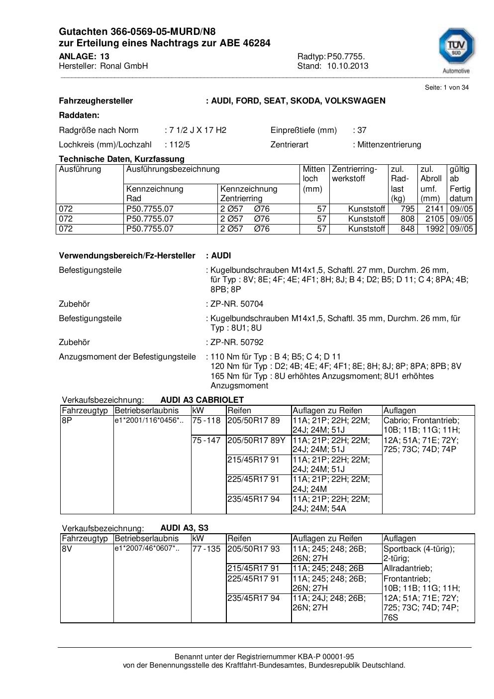 Dieses Gutachten (abe) bezieht sich auf die Alufelge Ronal P50.7755 in der Ausführung 2Jx17 ET 0, Mittenloch 0 mm (KBA 46284). Im PDF findest du typischerweise zulässige Reifengrößen, Auflagen/Anbauhinweise und – je nach Dokument – Hinweise zur Eintragung.