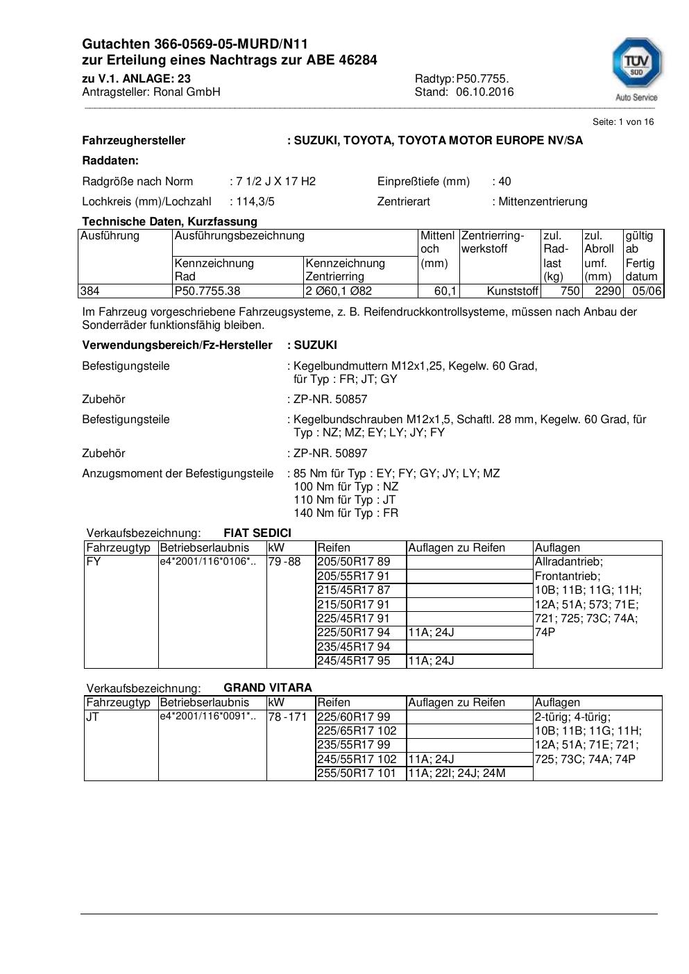 Dieses Gutachten (abe) bezieht sich auf die Alufelge Ronal P50.7755 in der Ausführung 2Jx17 ET 0, Mittenloch 0 mm (KBA 46284). Im PDF findest du typischerweise zulässige Reifengrößen, Auflagen/Anbauhinweise und – je nach Dokument – Hinweise zur Eintragung.