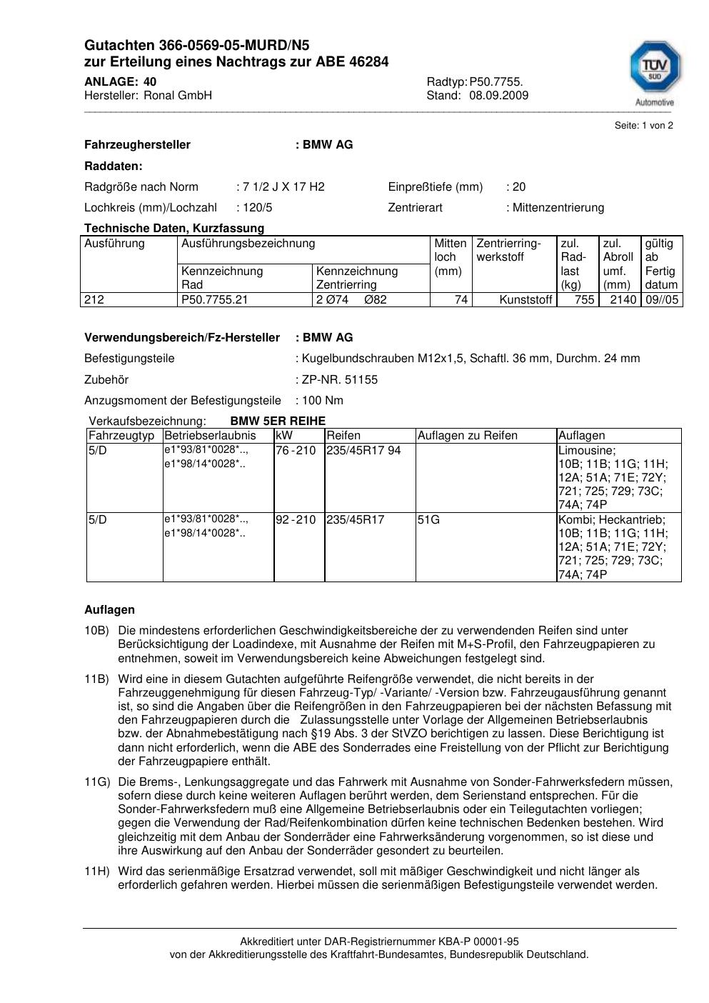 Dieses Gutachten (abe) bezieht sich auf die Alufelge Ronal P50.7755 in der Ausführung 2Jx17 ET 0, Mittenloch 0 mm (KBA 46284). Im PDF findest du typischerweise zulässige Reifengrößen, Auflagen/Anbauhinweise und – je nach Dokument – Hinweise zur Eintragung.
