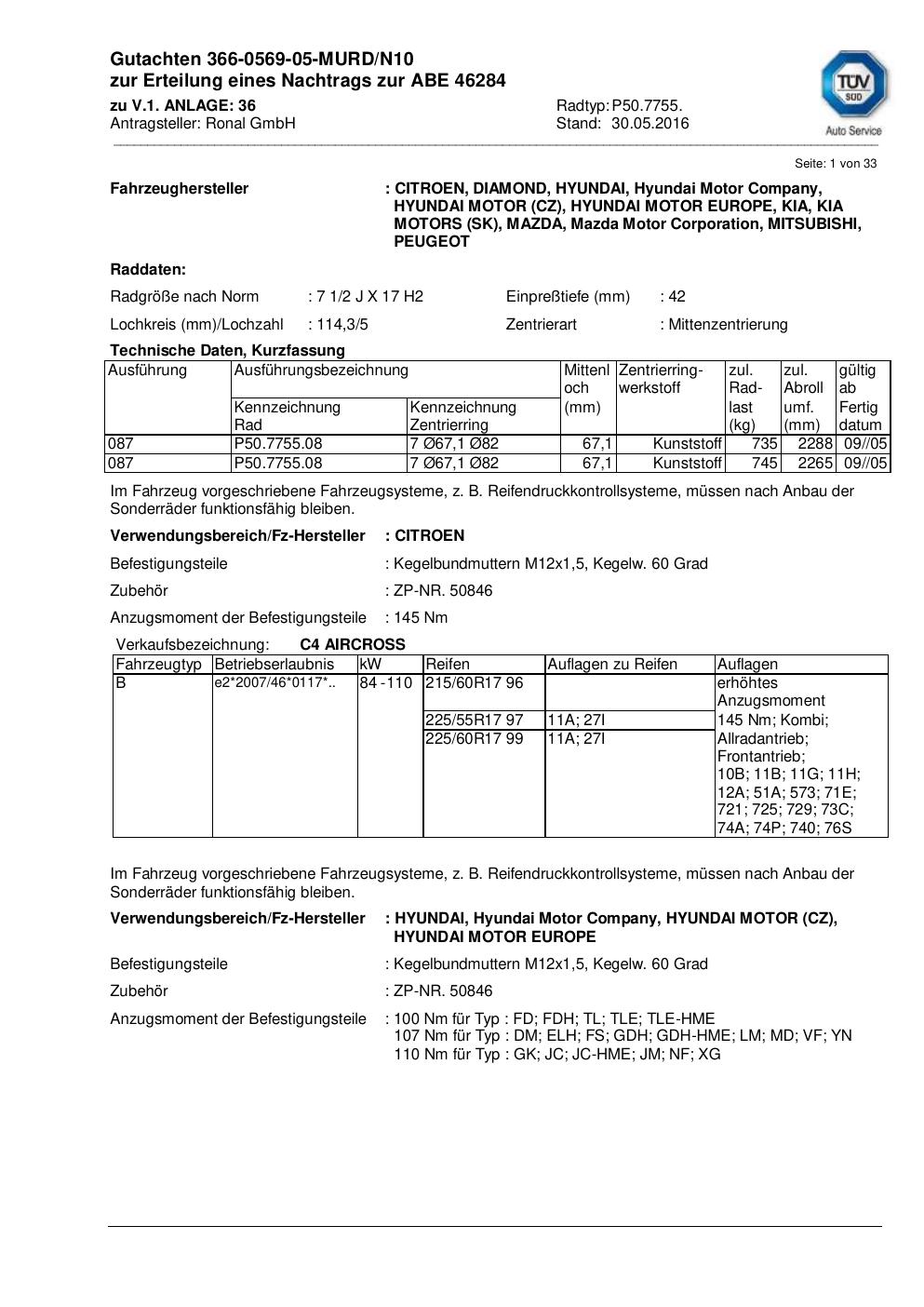 Dieses Gutachten (abe) bezieht sich auf die Alufelge Ronal P50.7755 in der Ausführung 2Jx17 ET 0, Mittenloch 0 mm (KBA 46284). Im PDF findest du typischerweise zulässige Reifengrößen, Auflagen/Anbauhinweise und – je nach Dokument – Hinweise zur Eintragung.