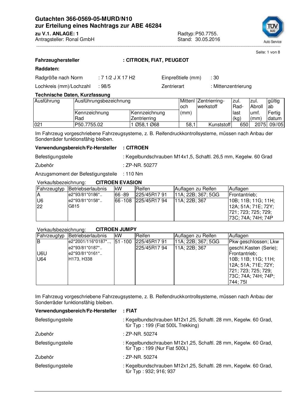 Dieses Gutachten (abe) bezieht sich auf die Alufelge Ronal P50.7755 in der Ausführung 2Jx17 ET 0, Mittenloch 0 mm (KBA 46284). Im PDF findest du typischerweise zulässige Reifengrößen, Auflagen/Anbauhinweise und – je nach Dokument – Hinweise zur Eintragung.