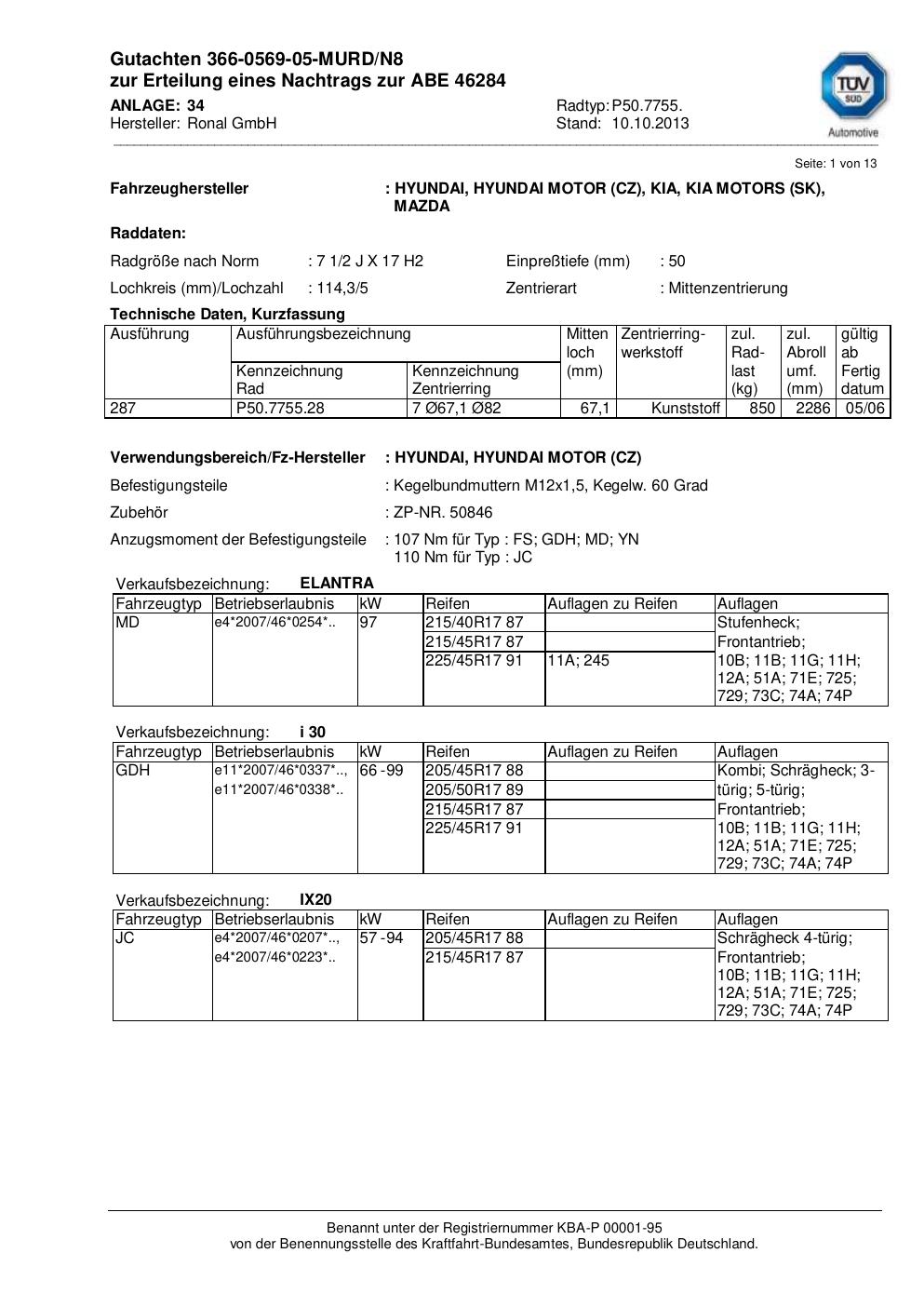 Dieses Gutachten (abe) bezieht sich auf die Alufelge Ronal P50.7755 in der Ausführung 2Jx17 ET 0, Mittenloch 0 mm (KBA 46284). Im PDF findest du typischerweise zulässige Reifengrößen, Auflagen/Anbauhinweise und – je nach Dokument – Hinweise zur Eintragung.