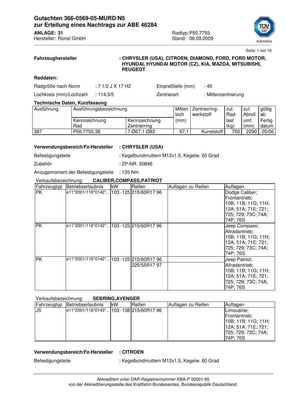 Dieses Gutachten (abe) bezieht sich auf die Alufelge Ronal P50.7755 in der Ausführung 2Jx17 ET 0, Mittenloch 0 mm (KBA 46284). Im PDF findest du typischerweise zulässige Reifengrößen, Auflagen/Anbauhinweise und – je nach Dokument – Hinweise zur Eintragung.