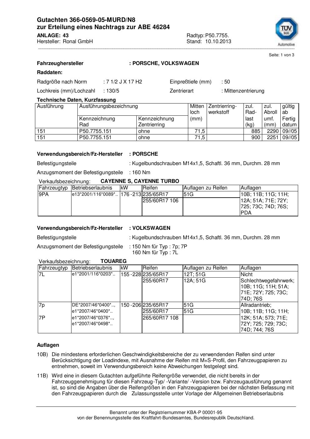 Dieses Gutachten (abe) bezieht sich auf die Alufelge Ronal P50.7755 in der Ausführung 2Jx17 ET 0, Mittenloch 0 mm (KBA 46284). Im PDF findest du typischerweise zulässige Reifengrößen, Auflagen/Anbauhinweise und – je nach Dokument – Hinweise zur Eintragung.