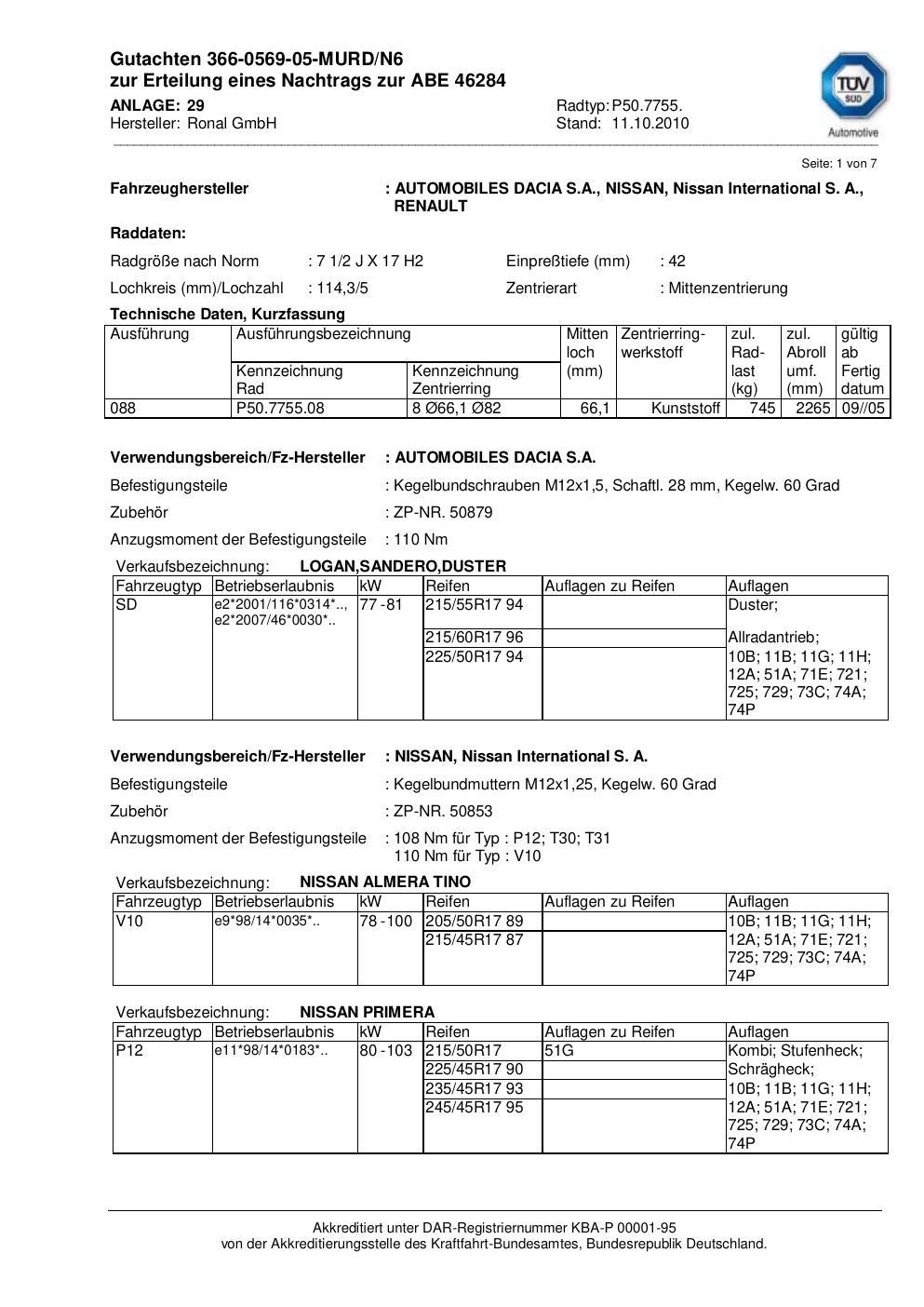Dieses Gutachten (abe) bezieht sich auf die Alufelge Ronal P50.7755 in der Ausführung 2Jx17 ET 0, Mittenloch 0 mm (KBA 46284). Im PDF findest du typischerweise zulässige Reifengrößen, Auflagen/Anbauhinweise und – je nach Dokument – Hinweise zur Eintragung.