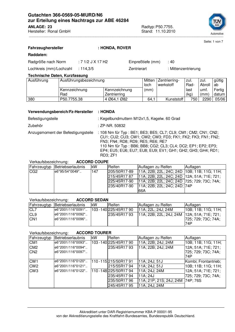 Dieses Gutachten (abe) bezieht sich auf die Alufelge Ronal P50.7755 in der Ausführung 2Jx17 ET 0, Mittenloch 0 mm (KBA 46284). Im PDF findest du typischerweise zulässige Reifengrößen, Auflagen/Anbauhinweise und – je nach Dokument – Hinweise zur Eintragung.