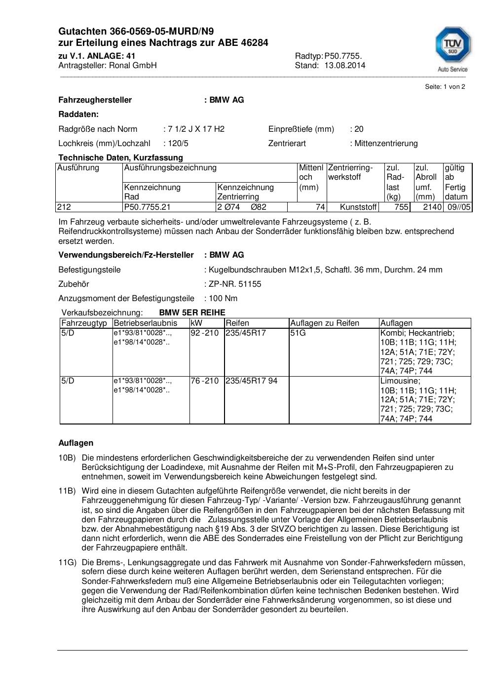 Dieses Gutachten (abe) bezieht sich auf die Alufelge Ronal P50.7755 in der Ausführung 2Jx17 ET 0, Mittenloch 0 mm (KBA 46284). Im PDF findest du typischerweise zulässige Reifengrößen, Auflagen/Anbauhinweise und – je nach Dokument – Hinweise zur Eintragung.