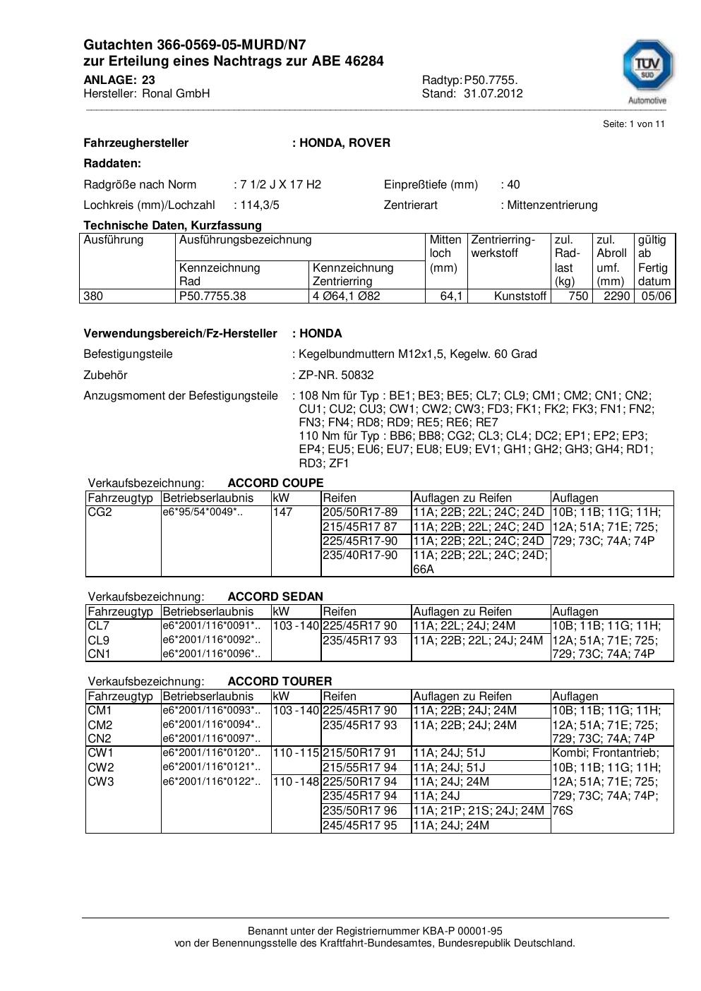 Dieses Gutachten (abe) bezieht sich auf die Alufelge Ronal P50.7755 in der Ausführung 2Jx17 ET 0, Mittenloch 0 mm (KBA 46284). Im PDF findest du typischerweise zulässige Reifengrößen, Auflagen/Anbauhinweise und – je nach Dokument – Hinweise zur Eintragung.