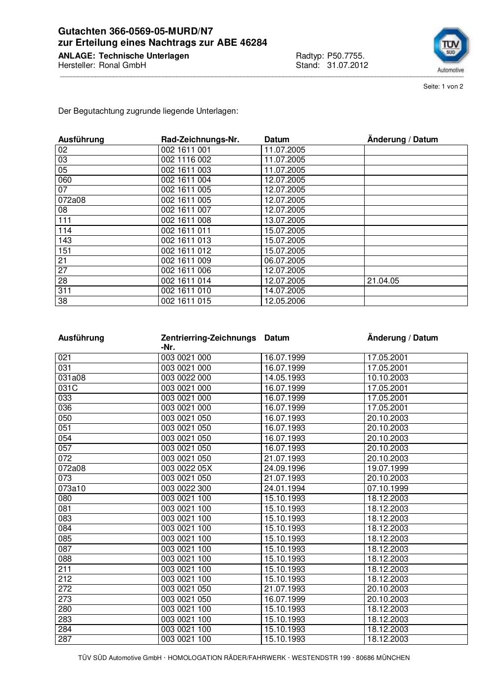 Felgengutachten / abe für Alufelgen Ronal P50.7755 (5Jx24 ET 0, Mittenloch 0 mm) mit KBA 46284 (Zertifikatsnummer 46284). Hier kostenlos als PDF herunterladen. Der Download-Link ist 24 Stunden gültig und kann bis zu zwei Mal verwendet werden.