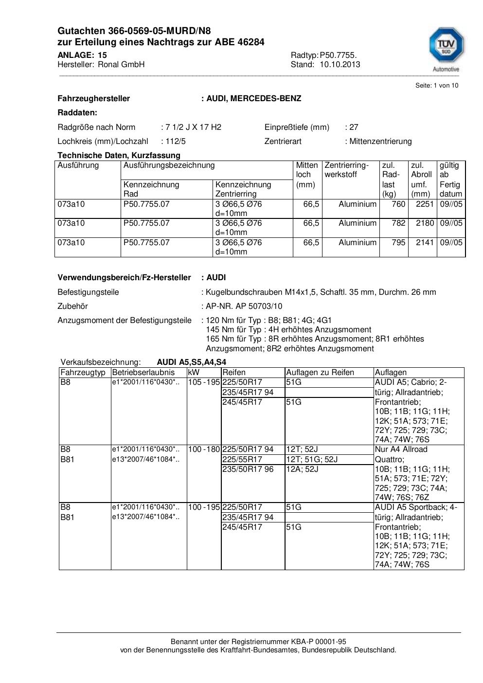 Felgengutachten / abe für Alufelgen Ronal P50.7755 (2Jx17 ET 0, Mittenloch 0 mm) mit KBA 46284 (Zertifikatsnummer 46284). Hier kostenlos als PDF herunterladen. Der Download-Link ist 24 Stunden gültig und kann bis zu zwei Mal verwendet werden.