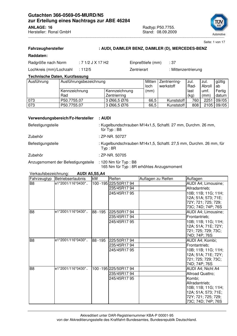 Dieses Gutachten (abe) bezieht sich auf die Alufelge Ronal P50.7755 in der Ausführung 2Jx17 ET 0, Mittenloch 0 mm (KBA 46284). Im PDF findest du typischerweise zulässige Reifengrößen, Auflagen/Anbauhinweise und – je nach Dokument – Hinweise zur Eintragung.