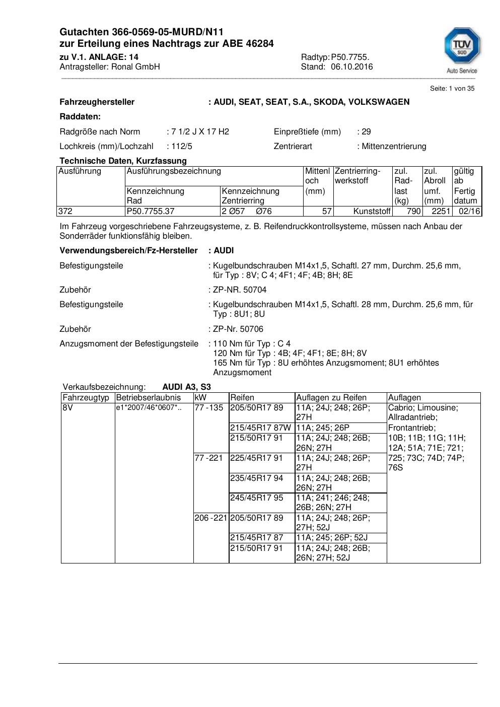Dieses Gutachten (abe) bezieht sich auf die Alufelge Ronal P50.7755 in der Ausführung 2Jx17 ET 0, Mittenloch 0 mm (KBA 46284). Im PDF findest du typischerweise zulässige Reifengrößen, Auflagen/Anbauhinweise und – je nach Dokument – Hinweise zur Eintragung.