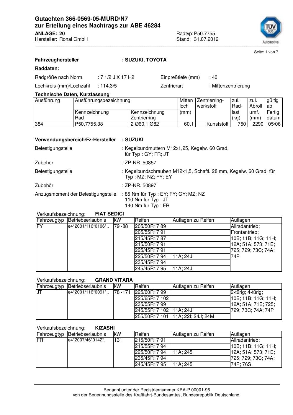 Dieses Gutachten (abe) bezieht sich auf die Alufelge Ronal P50.7755 in der Ausführung 2Jx17 ET 0, Mittenloch 0 mm (KBA 46284). Im PDF findest du typischerweise zulässige Reifengrößen, Auflagen/Anbauhinweise und – je nach Dokument – Hinweise zur Eintragung.