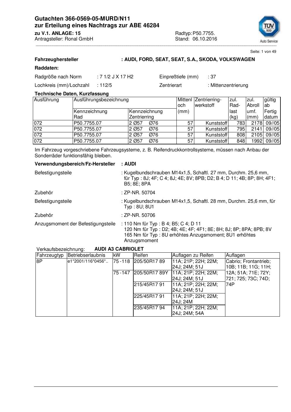 Dieses Gutachten (abe) bezieht sich auf die Alufelge Ronal P50.7755 in der Ausführung 2Jx17 ET 0, Mittenloch 0 mm (KBA 46284). Im PDF findest du typischerweise zulässige Reifengrößen, Auflagen/Anbauhinweise und – je nach Dokument – Hinweise zur Eintragung.