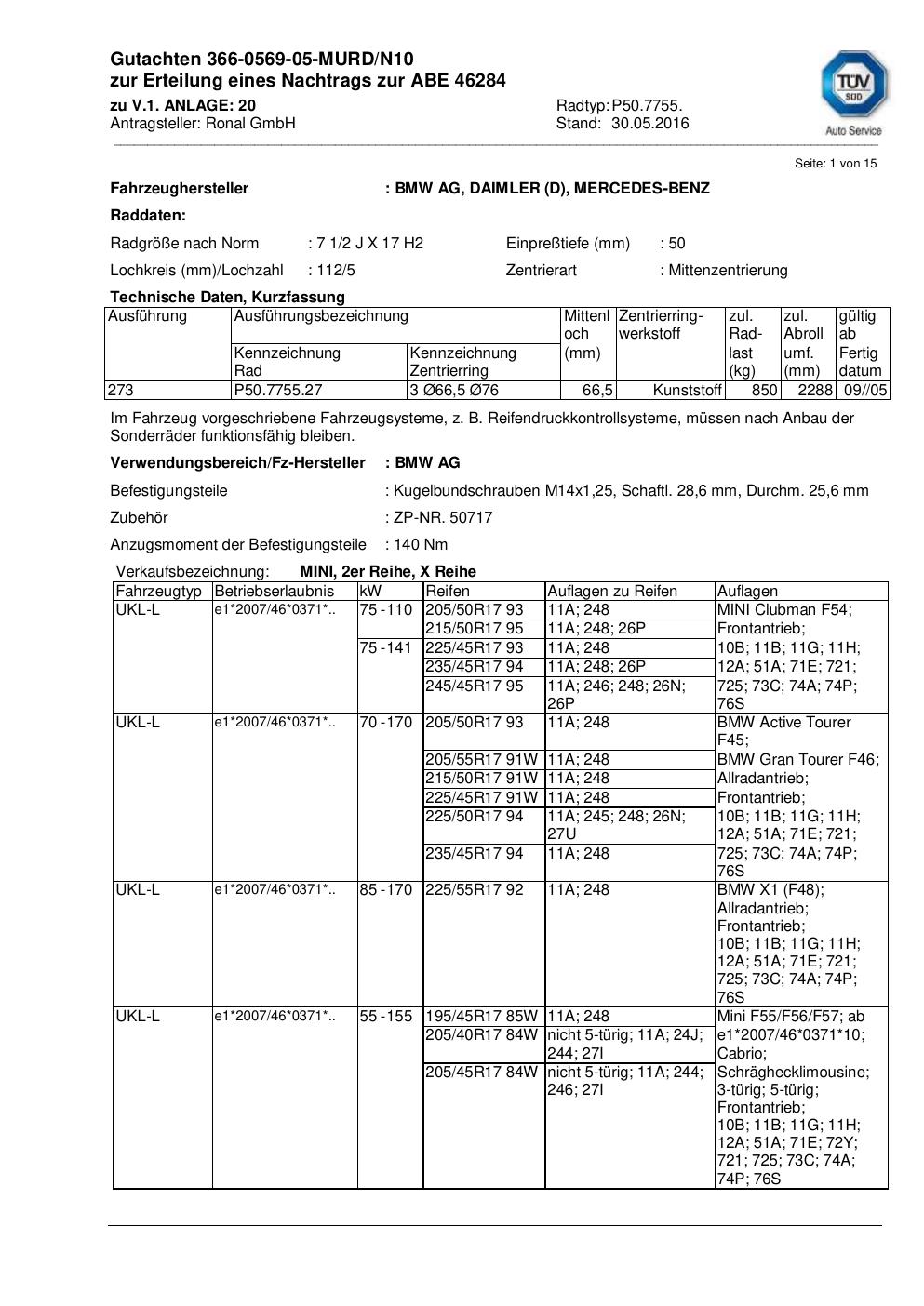 Dieses Gutachten (abe) bezieht sich auf die Alufelge Ronal P50.7755 in der Ausführung 2Jx17 ET 0, Mittenloch 0 mm (KBA 46284). Im PDF findest du typischerweise zulässige Reifengrößen, Auflagen/Anbauhinweise und – je nach Dokument – Hinweise zur Eintragung.