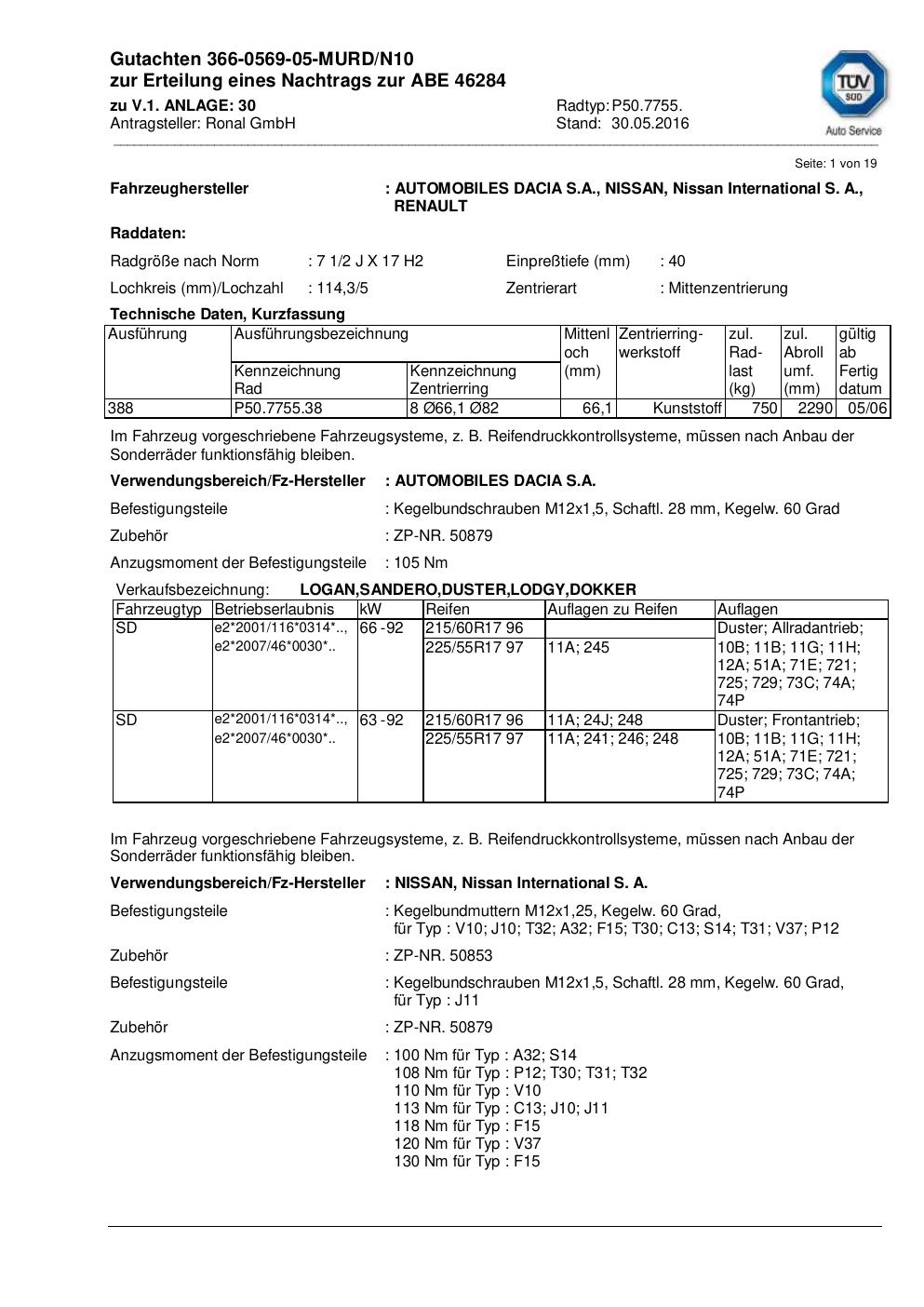 Dieses Gutachten (abe) bezieht sich auf die Alufelge Ronal P50.7755 in der Ausführung 2Jx17 ET 0, Mittenloch 0 mm (KBA 46284). Im PDF findest du typischerweise zulässige Reifengrößen, Auflagen/Anbauhinweise und – je nach Dokument – Hinweise zur Eintragung.