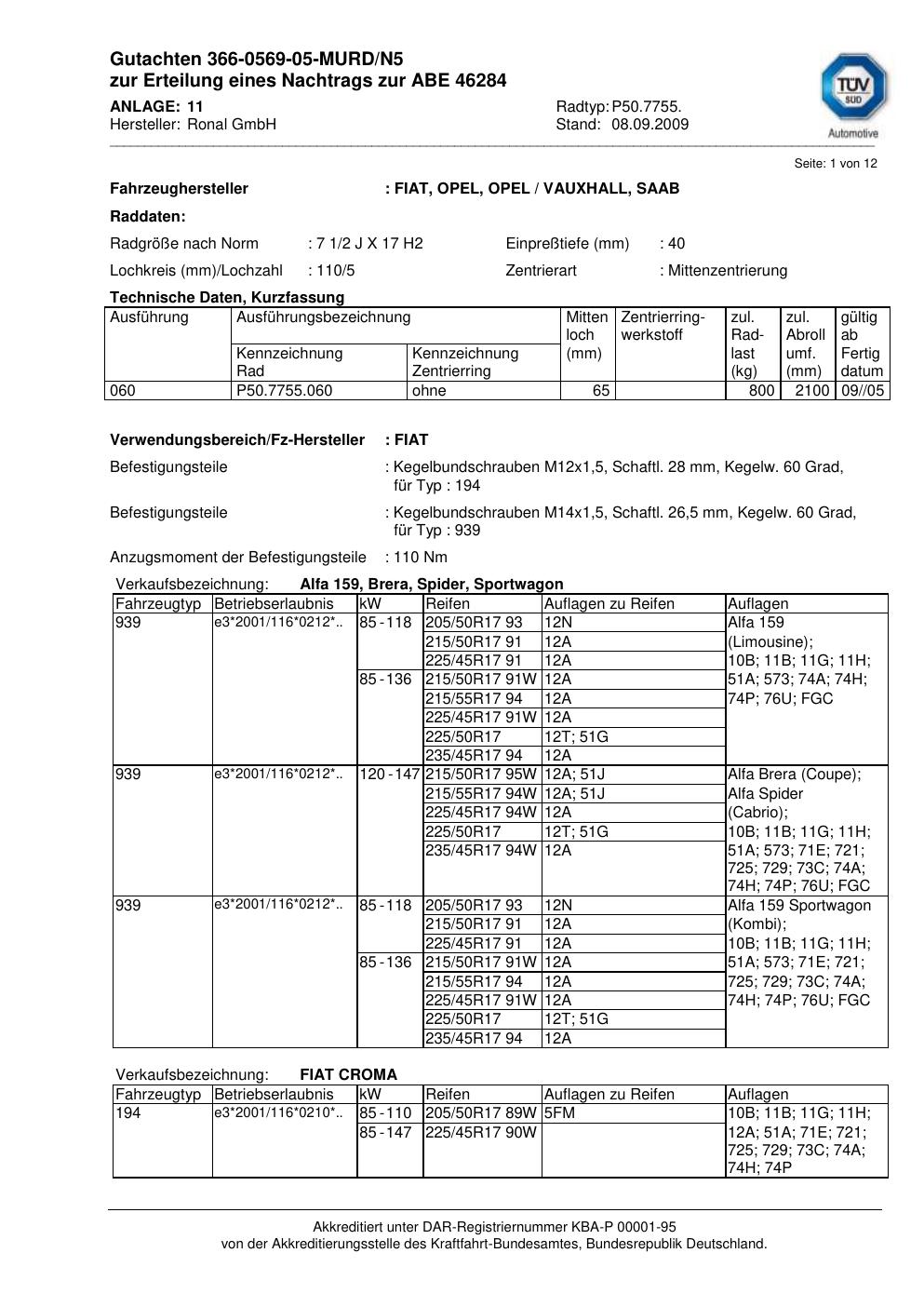 Felgengutachten / abe für Alufelgen Ronal P50.7755 (2Jx17 ET 0, Mittenloch 0 mm) mit KBA 46284 (Zertifikatsnummer 46284). Hier kostenlos als PDF herunterladen. Der Download-Link ist 24 Stunden gültig und kann bis zu zwei Mal verwendet werden.