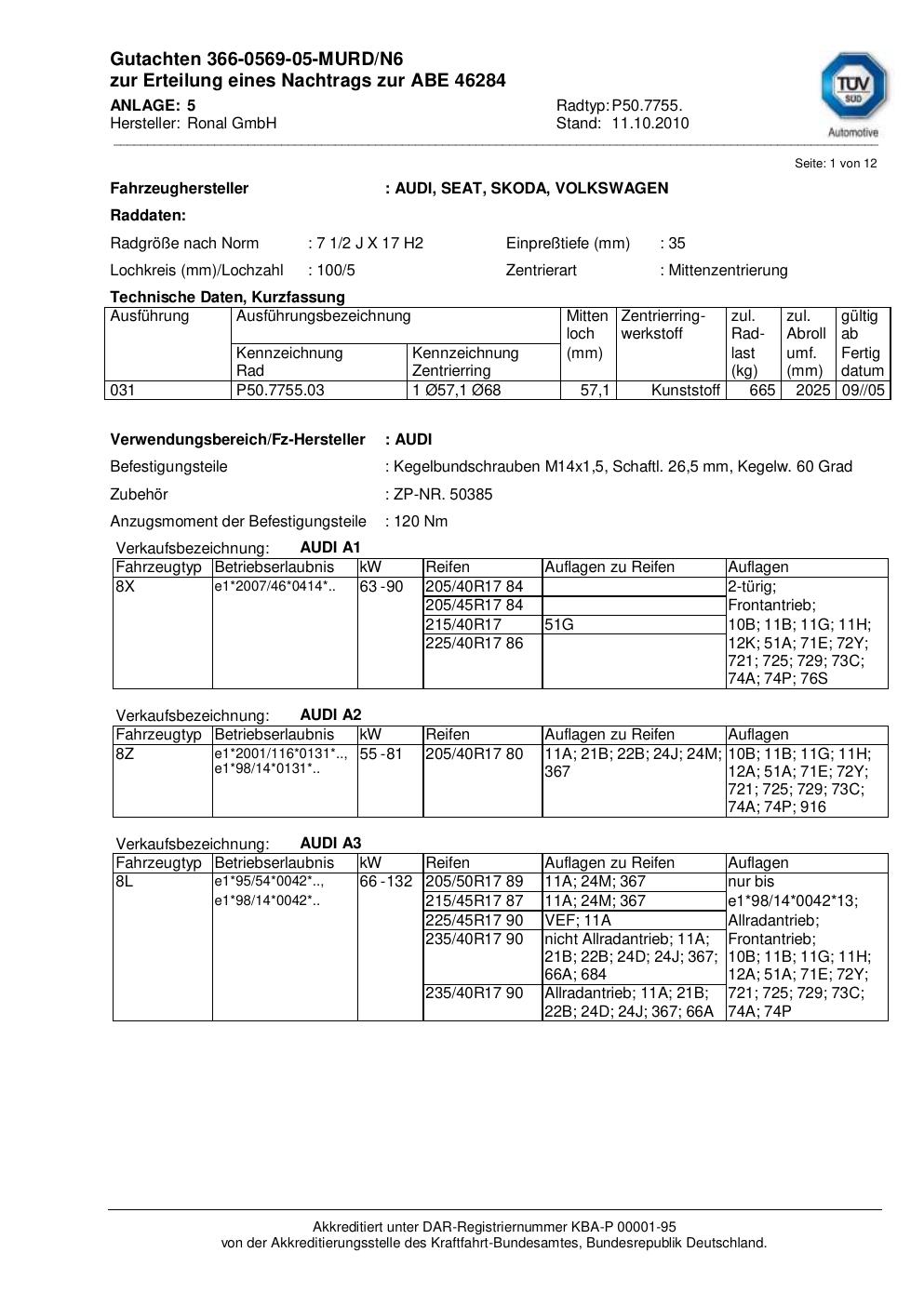 Dieses Gutachten (abe) bezieht sich auf die Alufelge Ronal P50.7755 in der Ausführung 2Jx17 ET 0, Mittenloch 0 mm (KBA 46284). Im PDF findest du typischerweise zulässige Reifengrößen, Auflagen/Anbauhinweise und – je nach Dokument – Hinweise zur Eintragung.