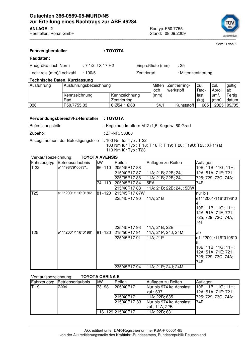 Dieses Gutachten (abe) bezieht sich auf die Alufelge Ronal P50.7755 in der Ausführung 2Jx17 ET 0, Mittenloch 0 mm (KBA 46284). Im PDF findest du typischerweise zulässige Reifengrößen, Auflagen/Anbauhinweise und – je nach Dokument – Hinweise zur Eintragung.