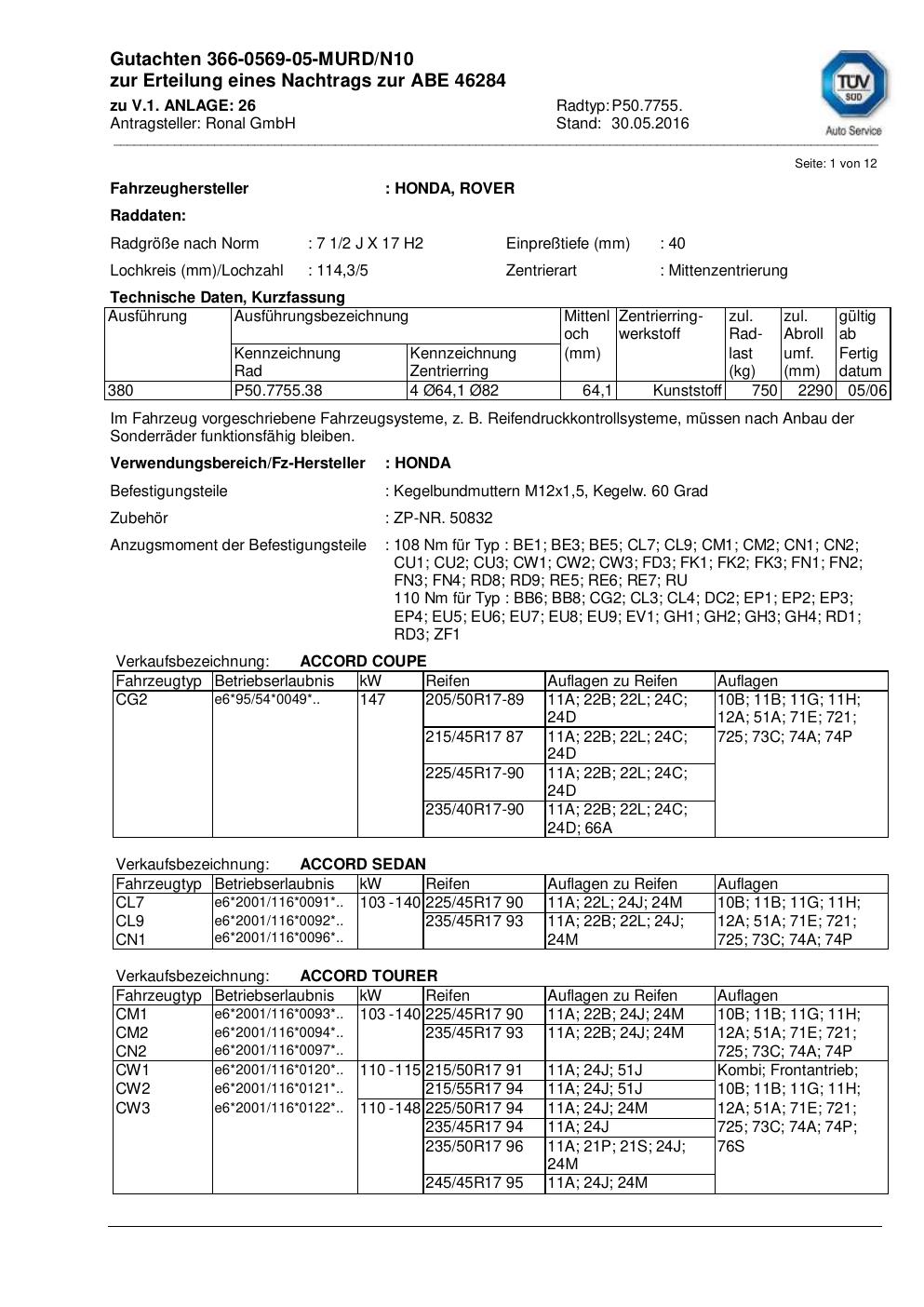 Dieses Gutachten (abe) bezieht sich auf die Alufelge Ronal P50.7755 in der Ausführung 2Jx17 ET 0, Mittenloch 0 mm (KBA 46284). Im PDF findest du typischerweise zulässige Reifengrößen, Auflagen/Anbauhinweise und – je nach Dokument – Hinweise zur Eintragung.