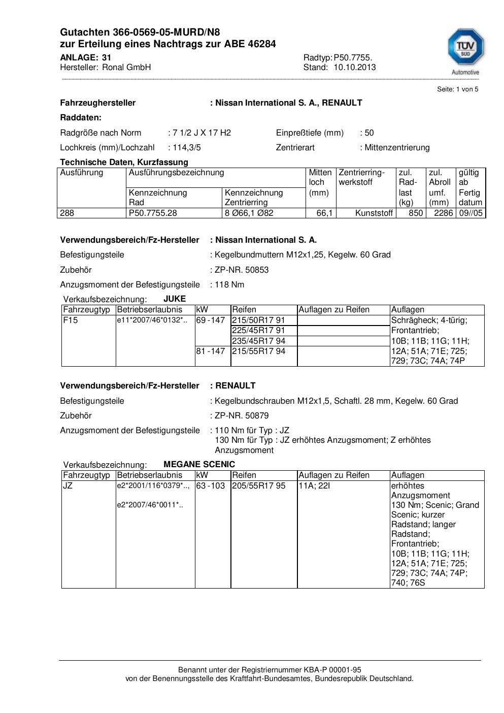 Dieses Gutachten (abe) bezieht sich auf die Alufelge Ronal P50.7755 in der Ausführung 2Jx17 ET 0, Mittenloch 0 mm (KBA 46284). Im PDF findest du typischerweise zulässige Reifengrößen, Auflagen/Anbauhinweise und – je nach Dokument – Hinweise zur Eintragung.