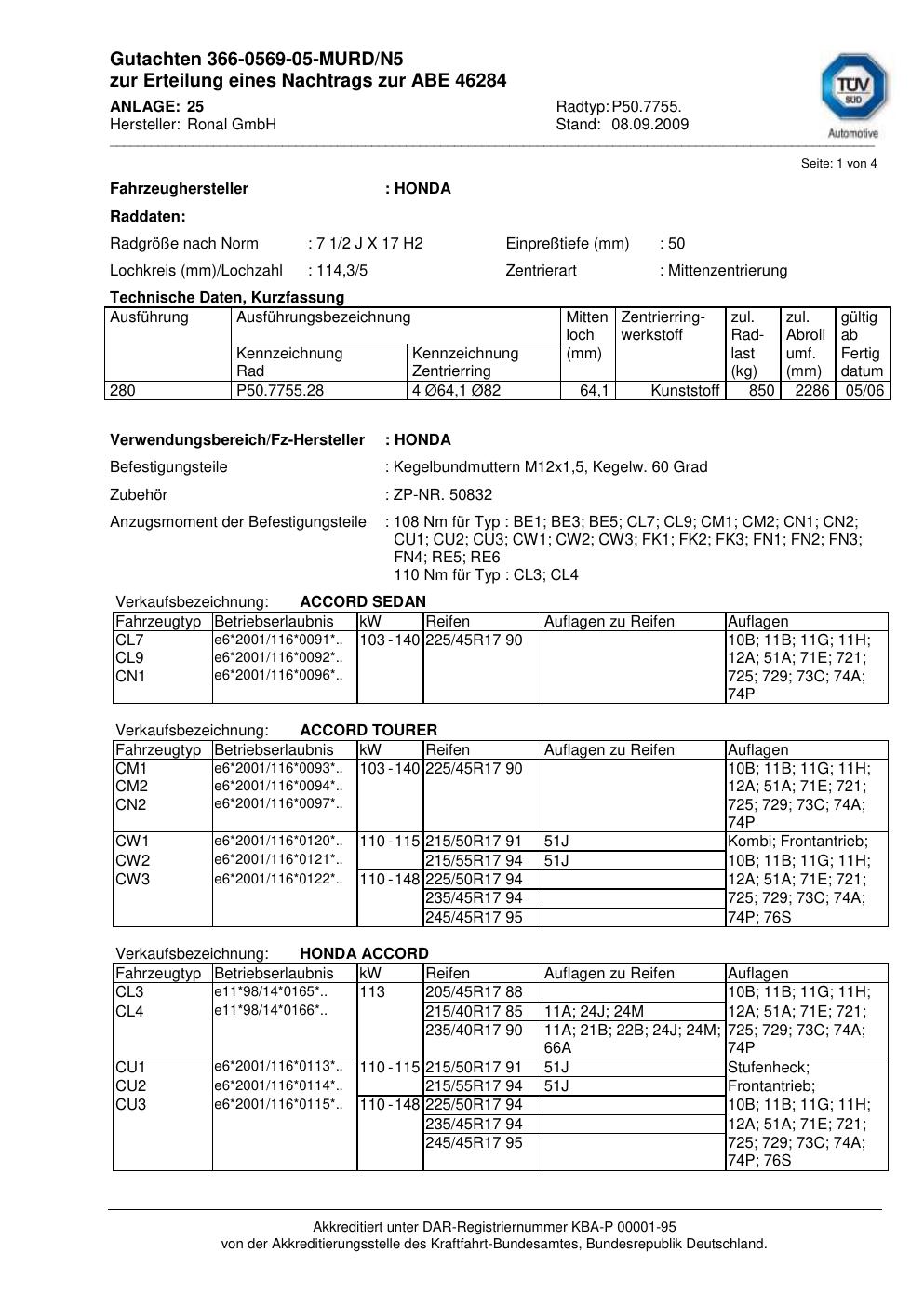 Dieses Gutachten (abe) bezieht sich auf die Alufelge Ronal P50.7755 in der Ausführung 2Jx17 ET 0, Mittenloch 0 mm (KBA 46284). Im PDF findest du typischerweise zulässige Reifengrößen, Auflagen/Anbauhinweise und – je nach Dokument – Hinweise zur Eintragung.