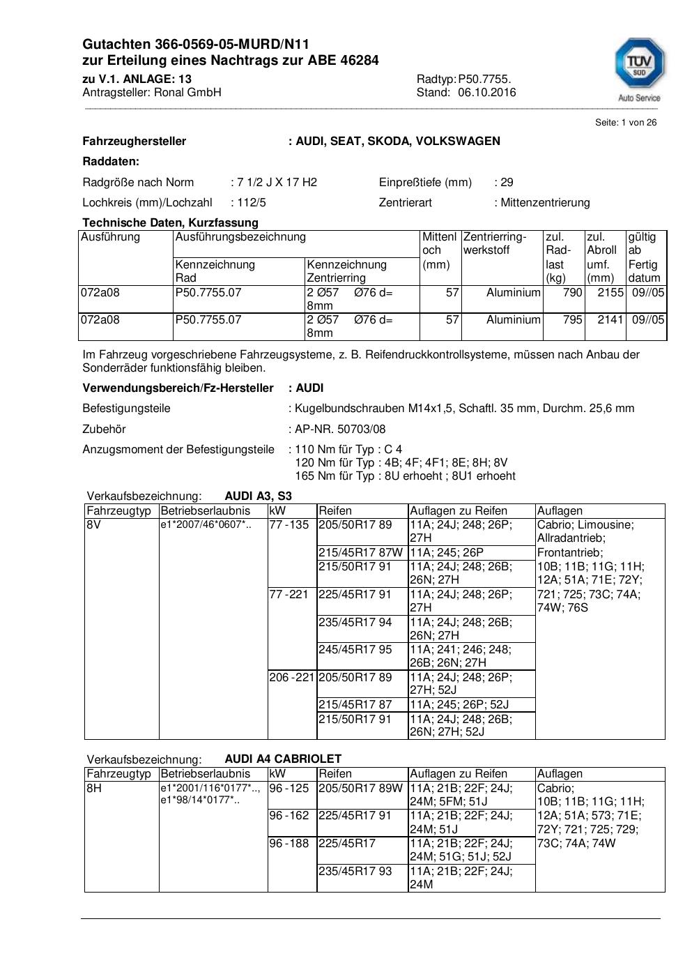 Felgengutachten / abe für Alufelgen Ronal P50.7755 (2Jx17 ET 0, Mittenloch 0 mm) mit KBA 46284 (Zertifikatsnummer 46284). Hier kostenlos als PDF herunterladen. Der Download-Link ist 24 Stunden gültig und kann bis zu zwei Mal verwendet werden.