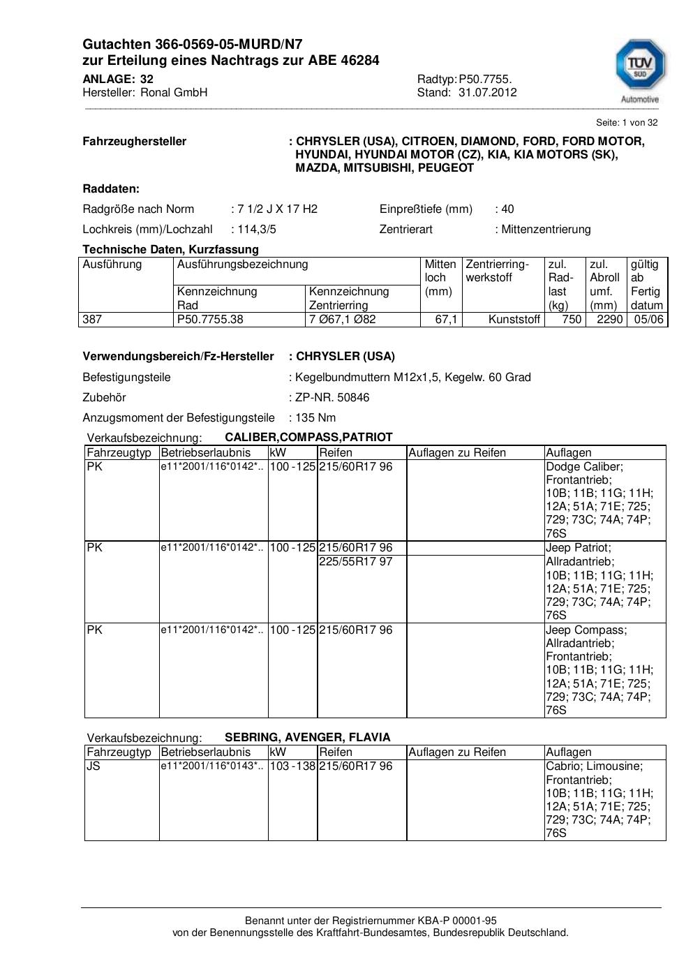 Dieses Gutachten (abe) bezieht sich auf die Alufelge Ronal P50.7755 in der Ausführung 2Jx17 ET 0, Mittenloch 0 mm (KBA 46284). Im PDF findest du typischerweise zulässige Reifengrößen, Auflagen/Anbauhinweise und – je nach Dokument – Hinweise zur Eintragung.