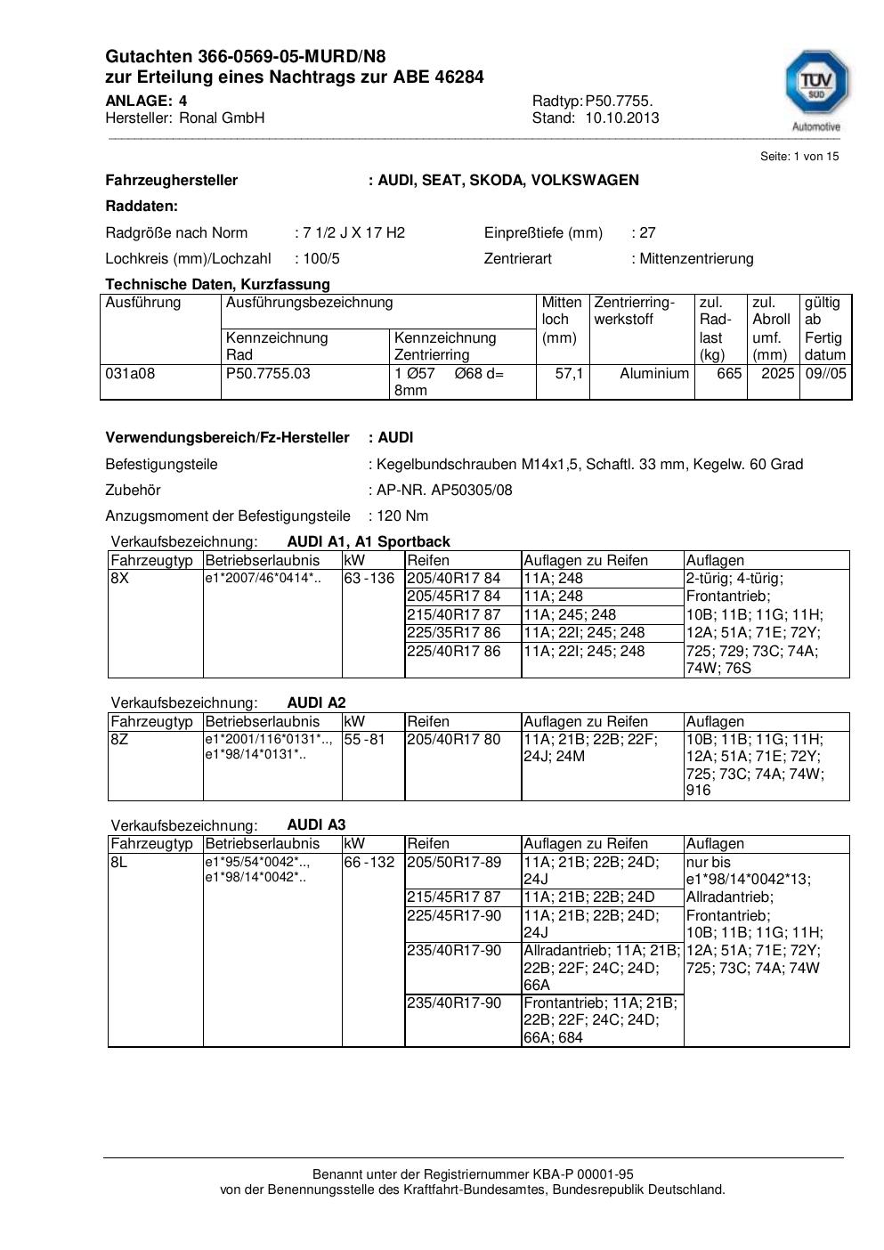 Dieses Gutachten (abe) bezieht sich auf die Alufelge Ronal P50.7755 in der Ausführung 2Jx17 ET 0, Mittenloch 0 mm (KBA 46284). Im PDF findest du typischerweise zulässige Reifengrößen, Auflagen/Anbauhinweise und – je nach Dokument – Hinweise zur Eintragung.
